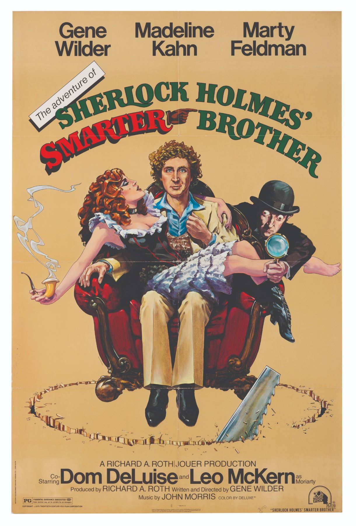 (20th Century Fox, 1975) A one-sheet for the theatrical release of “The Adventures of Sherlock Holmes' Smarter Brother,” starring, written, and directed by Gene Wilder. Measuring 27” x 41”, the poster is in good condition with light edge wear and creasing throughout, heavy wear and creasing in the lower corners and along the folds as issued, a price written in graphite at the bottom, and light separation at the crossfolds.