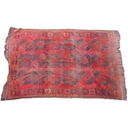An Afghan wool Esari, the wine red field enclosing three rows of six guls interspersed with cruciforms within serrated rosette border, secured with kelim skirts at either end, 315 x 230cm £250-350