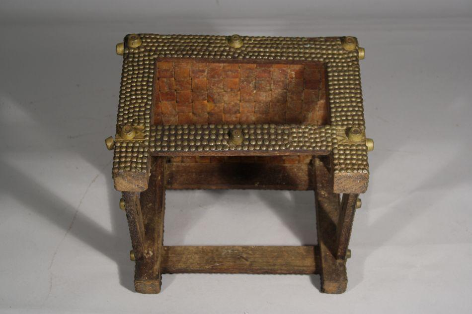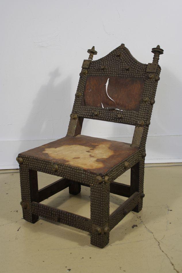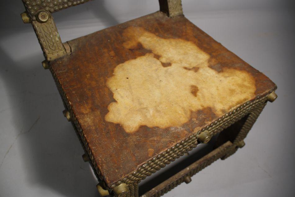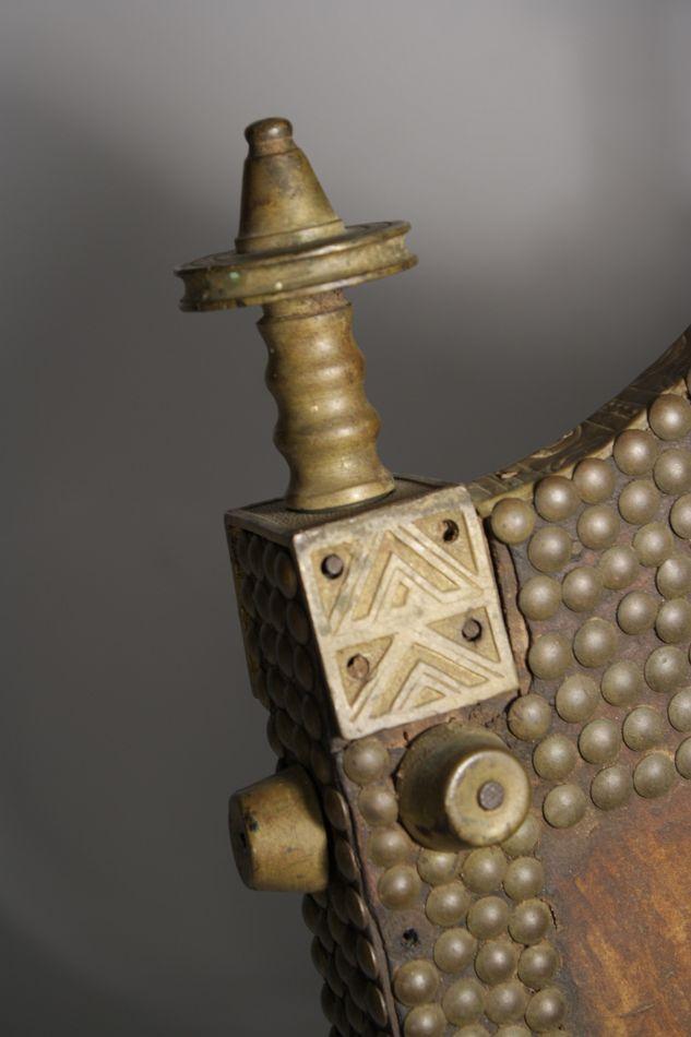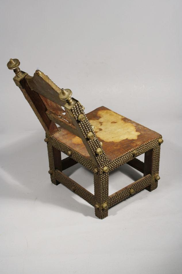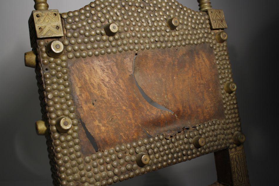 An African Carved Hardwood, Animal Hide and Brass Element Chair.