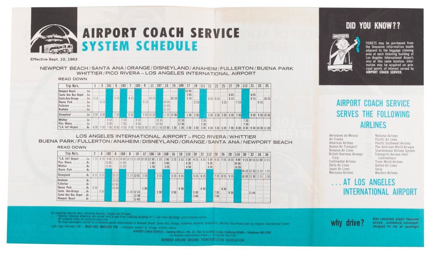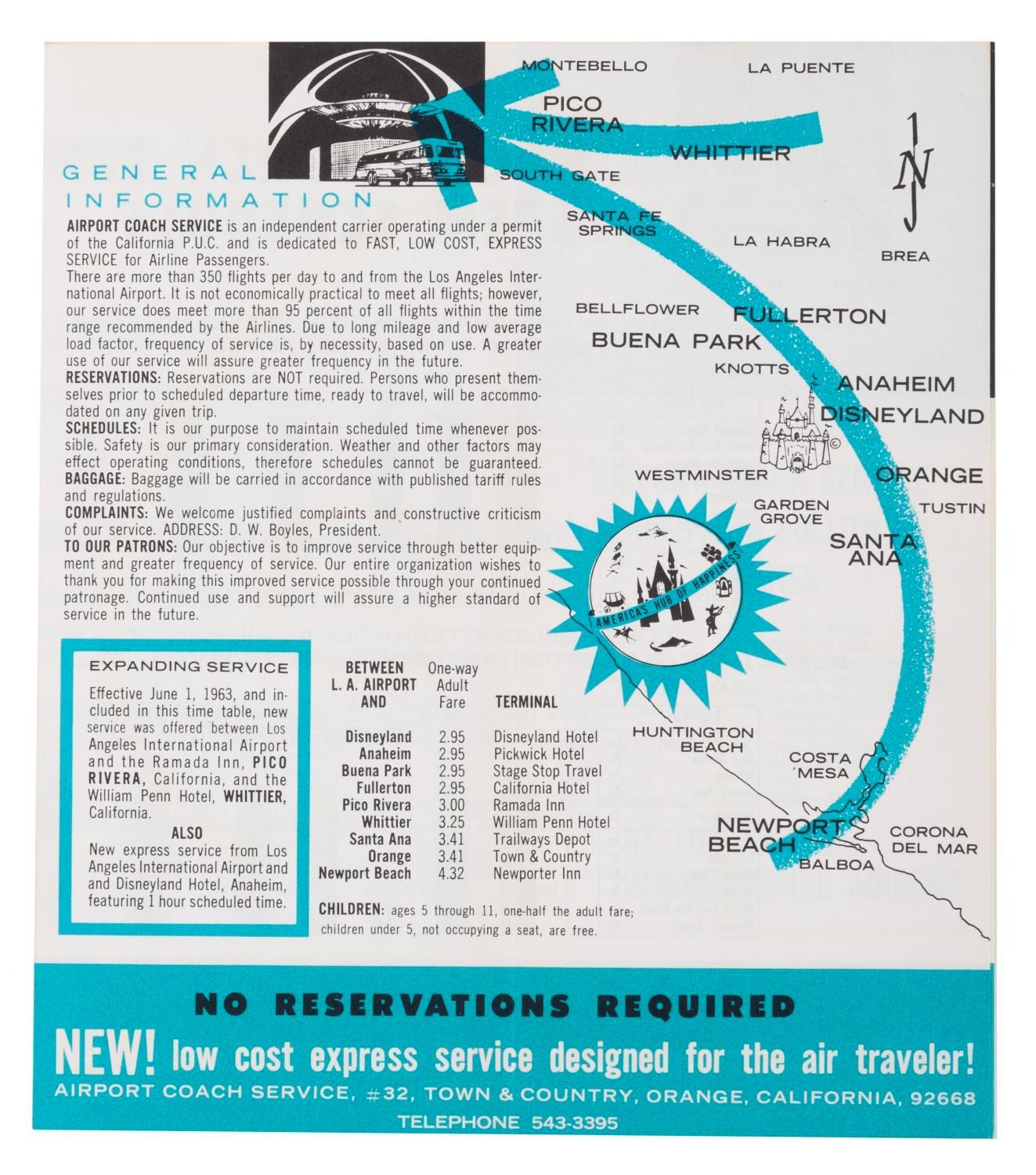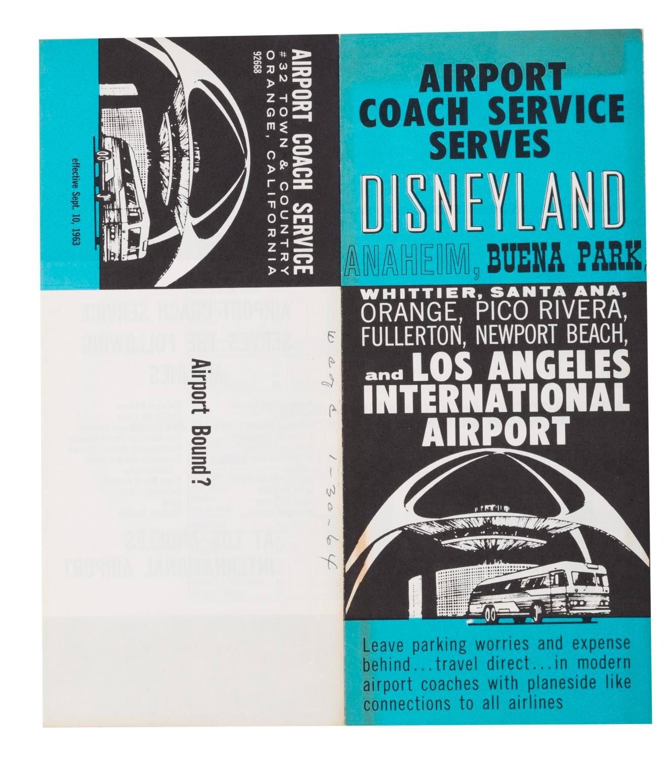 (Airport Coach, 1963-64) A brochure for the Airport Coach service to Disneyland featuring LAX’s "Googie" style Theme Building, built in 1961. Measuring 8" x 9.25", the brochure is in good condition with spots of discoloration, handling wear, and an ink inscription.