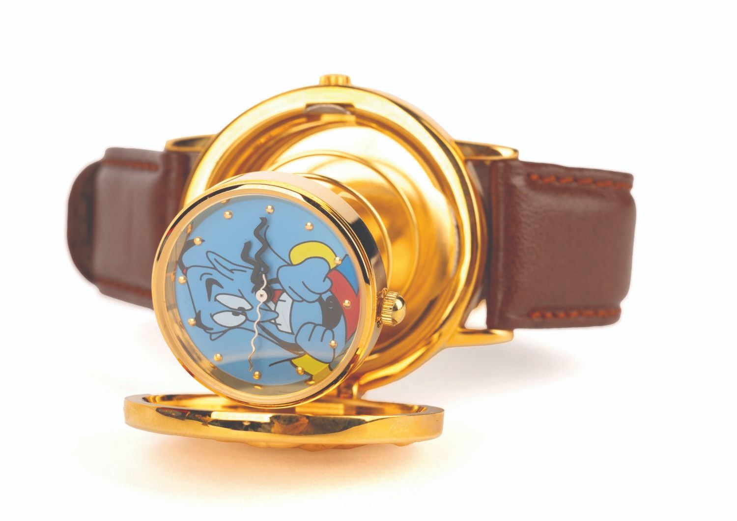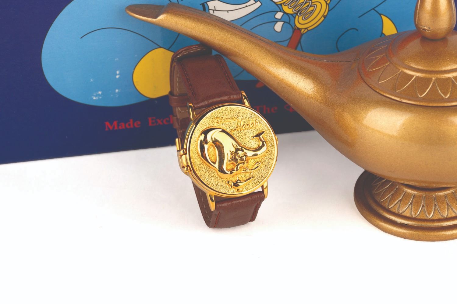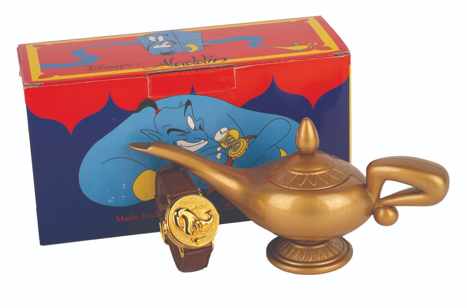 (Disney Store, 1992) A Disney Store exclusive pop-up wristwatch and lamp display released in time with the theatrical debut of Disney's "Aladdin." The hinged cover on the watch face pops open to reveal the Genie on a spring-mounted pop-up clock face. The set comes with a metal reproduction of the genie's lamp, and the original box. The watch and 8" x 3" x 4" tall lamp display in fine condition. The watch requires a battery and possibly service to function properly.