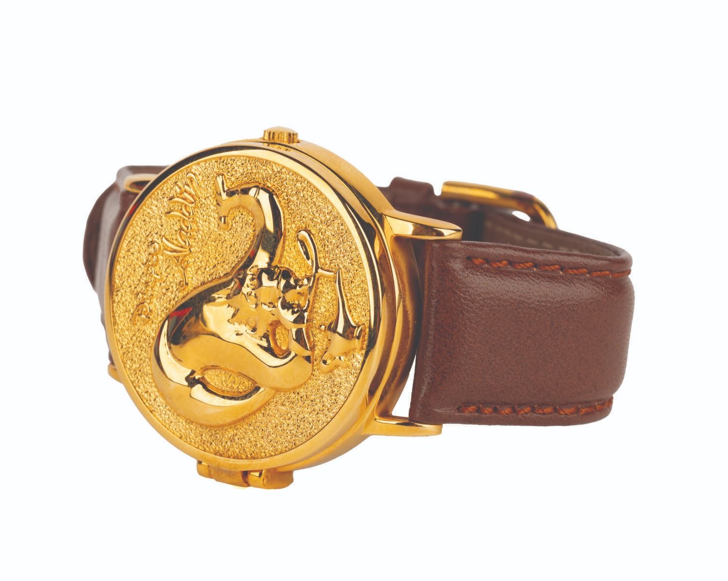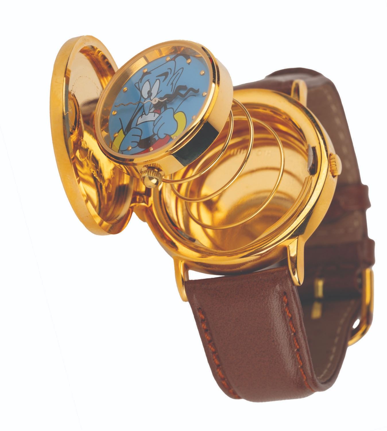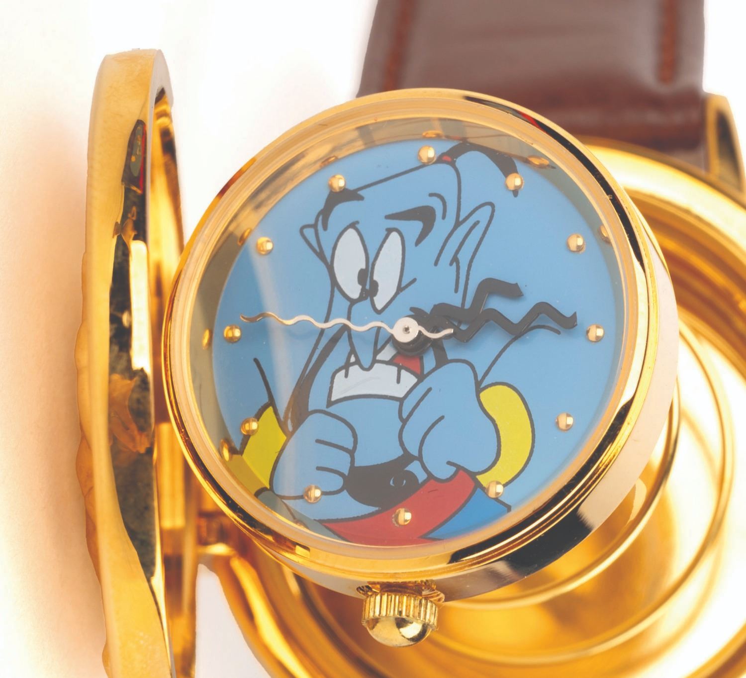(Disney Store, 1992) A Disney Store exclusive pop-up wristwatch and lamp display released in time with the theatrical debut of Disney's "Aladdin." The hinged cover on the watch face pops open to reveal the Genie on a spring-mounted pop-up clock face. The set comes with a metal reproduction of the genie's lamp, and the original box. The watch and 8" x 3" x 4" tall lamp display in fine condition. The watch requires a battery and possibly service to function properly.