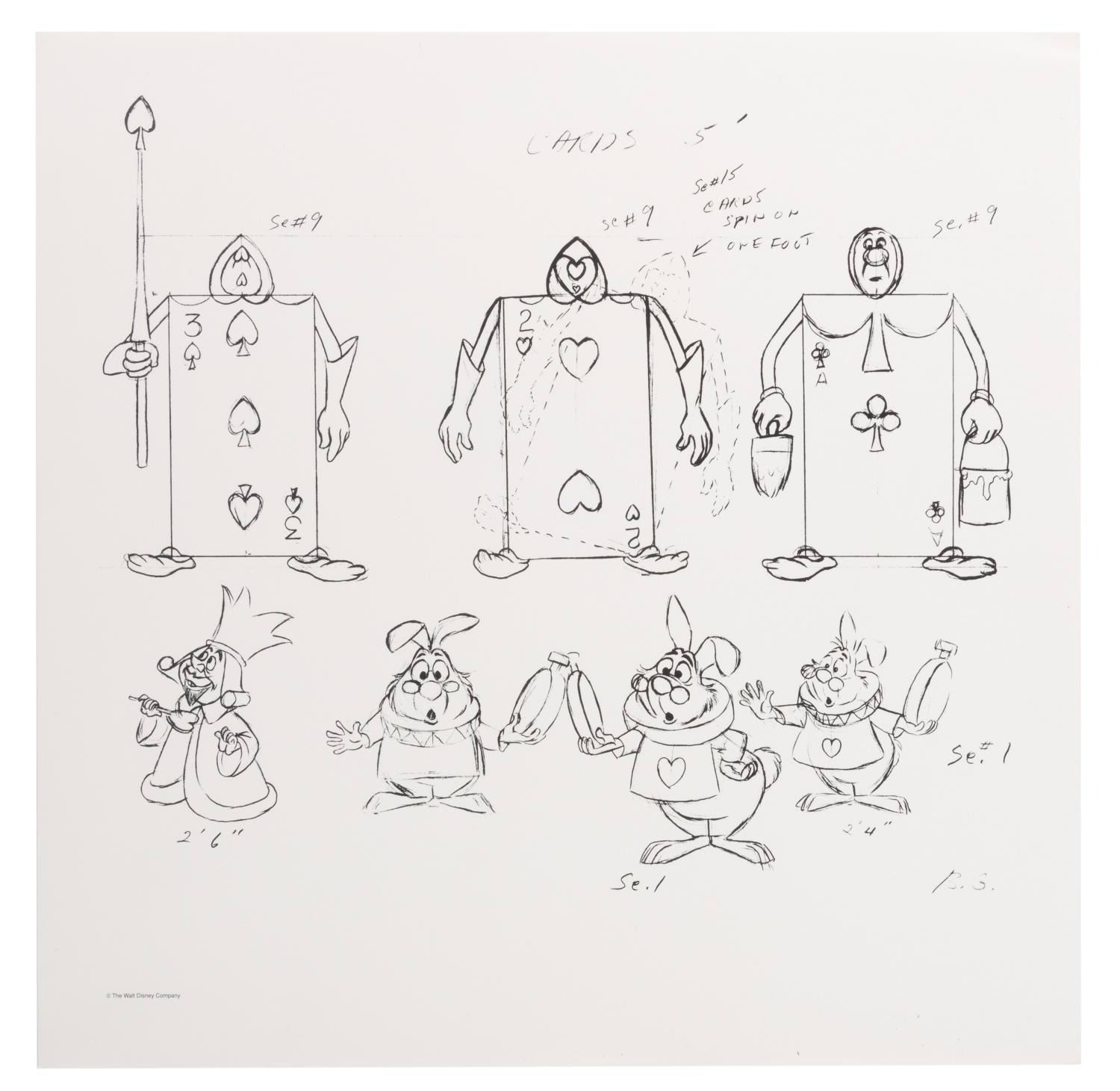 (Disneyland Hotel, 2000s) A high-quality print of concept artwork from "Alice in Wonderland." The print featuring the White Rabbit, King of Hearts, and the Card Guards was likely displayed as decor at the Disneyland Hotel. Measuring 15.5" x 15.5", the print displays in very good condition with scratches and a fold at the top right corner.