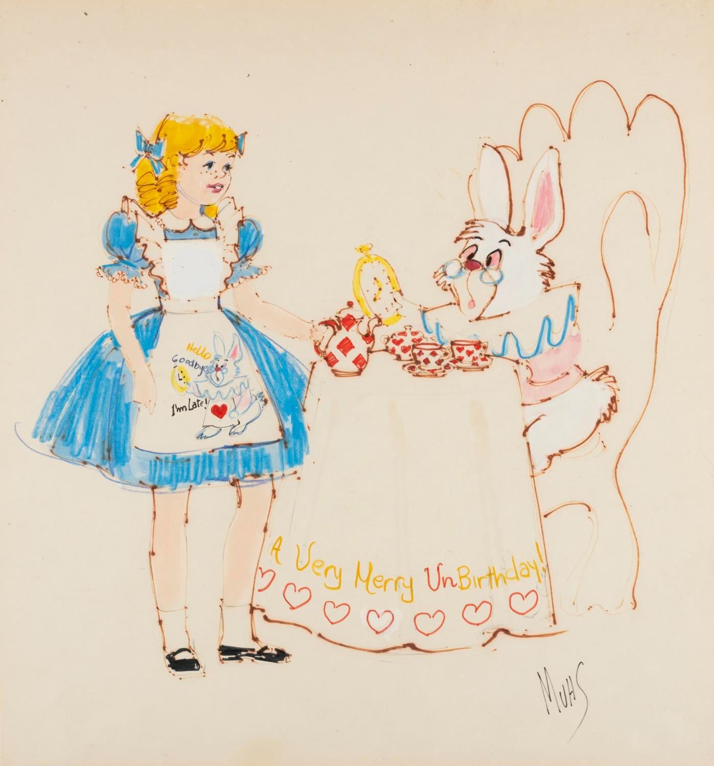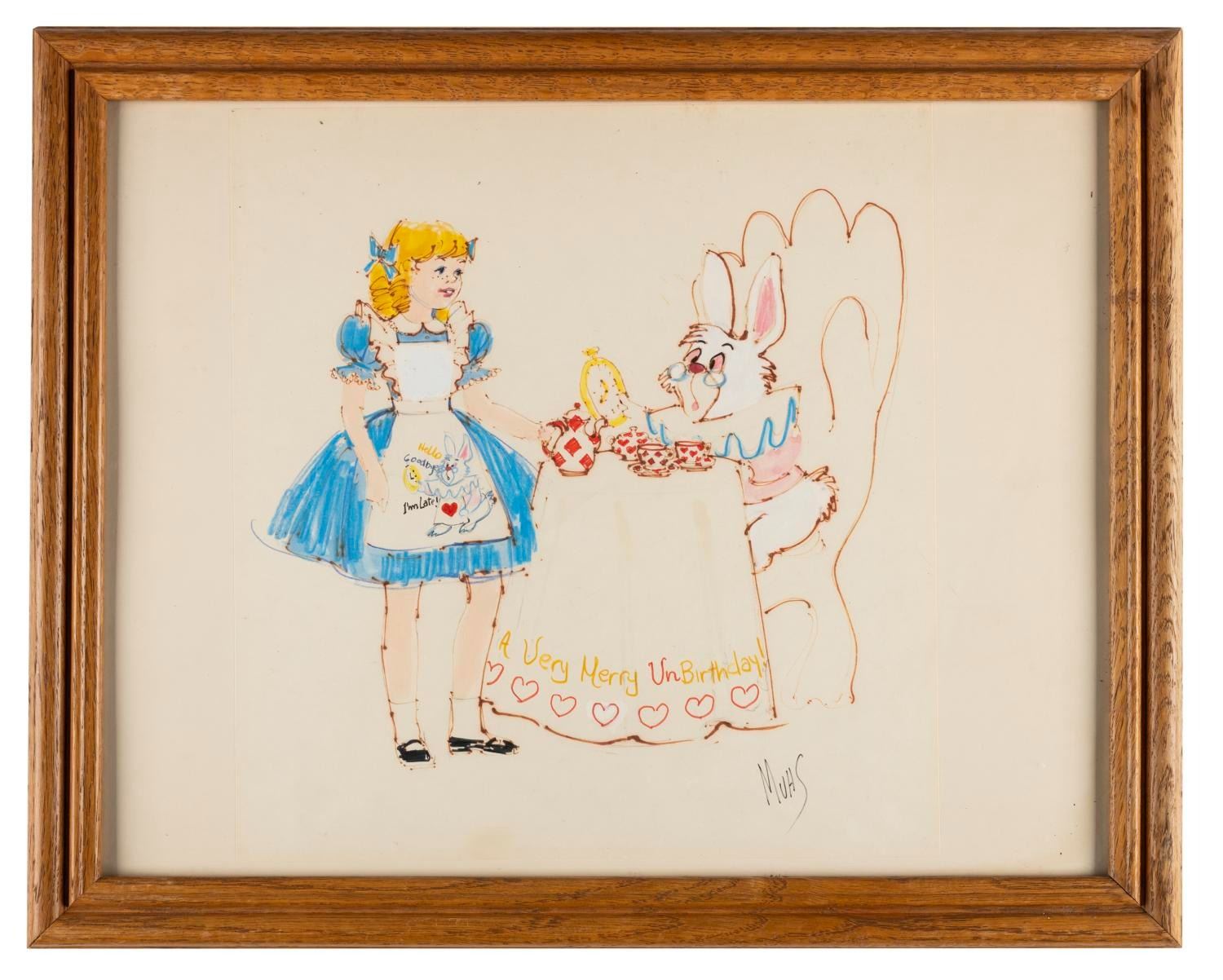 (1980s) An original Alice in Wonderland children's apparel design signed by the artist Jack Muhs, one of the first costume designers for the Disneyland Costuming Department, accomplished with a combination of pencil, felt tip markers, and colored pencils. Measuring 12.5" 13.25" on a 14" x 18" art board, the piece is in good condition with stains, pinholes, and water damage on the back of the art board and slight yellowing from age on both the art and board.