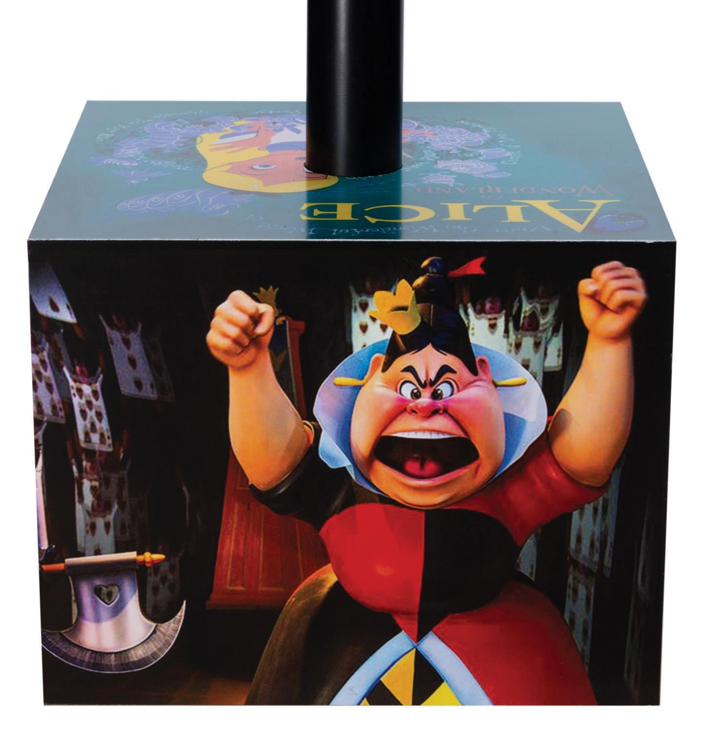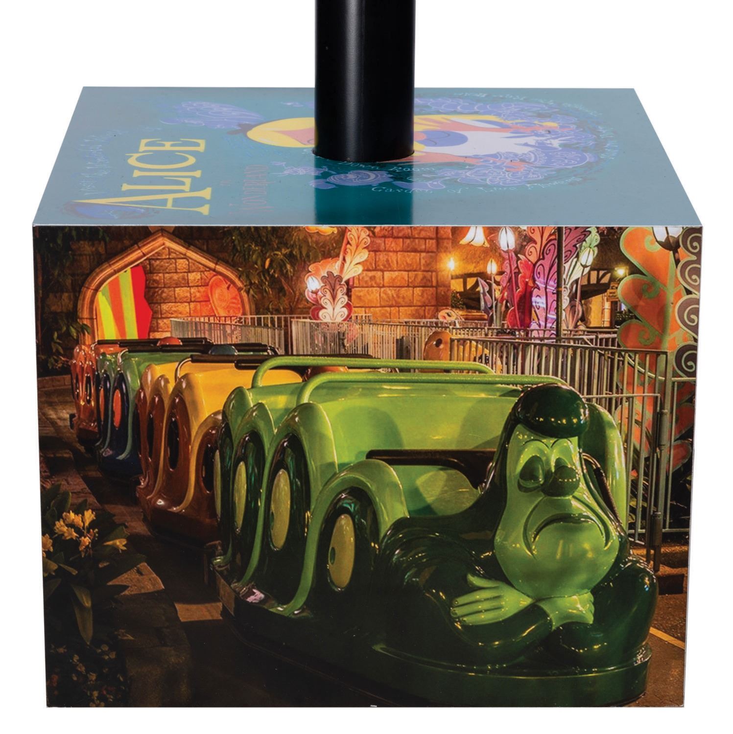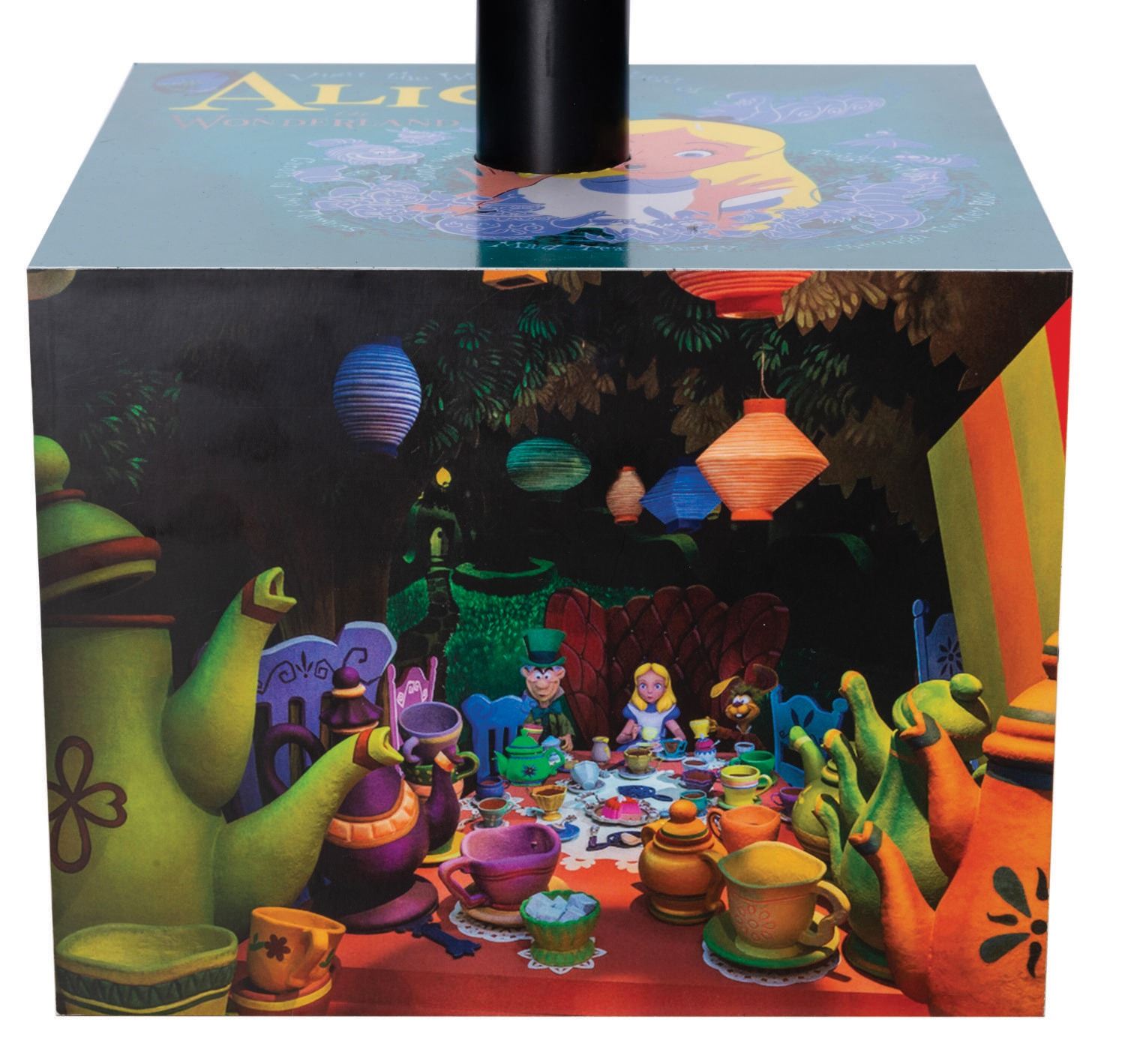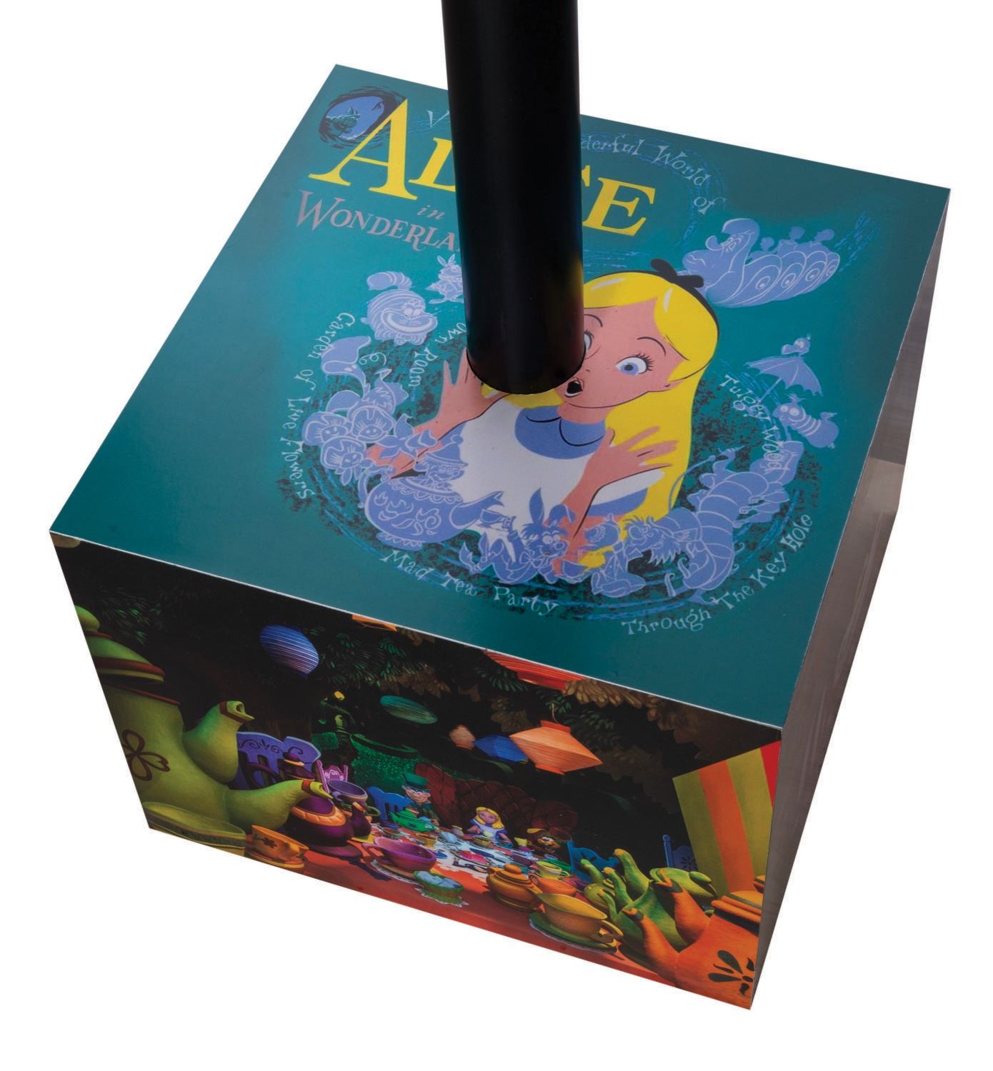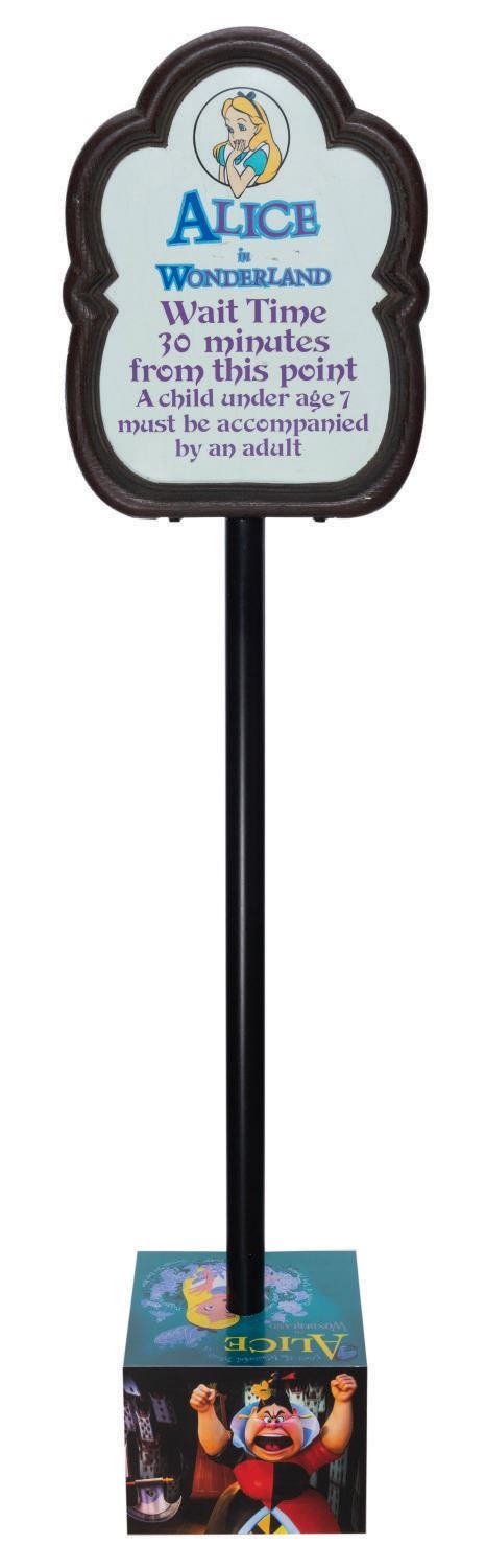 (Disneyland, 1990s) An Alice In Wonderland 30-Minute Wait Time Sign. This original double-sided, hand painted sign was once posted near the Alice in Wonderland attraction in Fantasyland at Disneyland. Measuring 14"x18.25" with a total height of 61.5" tall, the piece is in very good condition with wear from display, handling, and age. The entire piece is accompanied by custom attraction-inspired display base measuring 10.25"x10.25" and 8" tall.