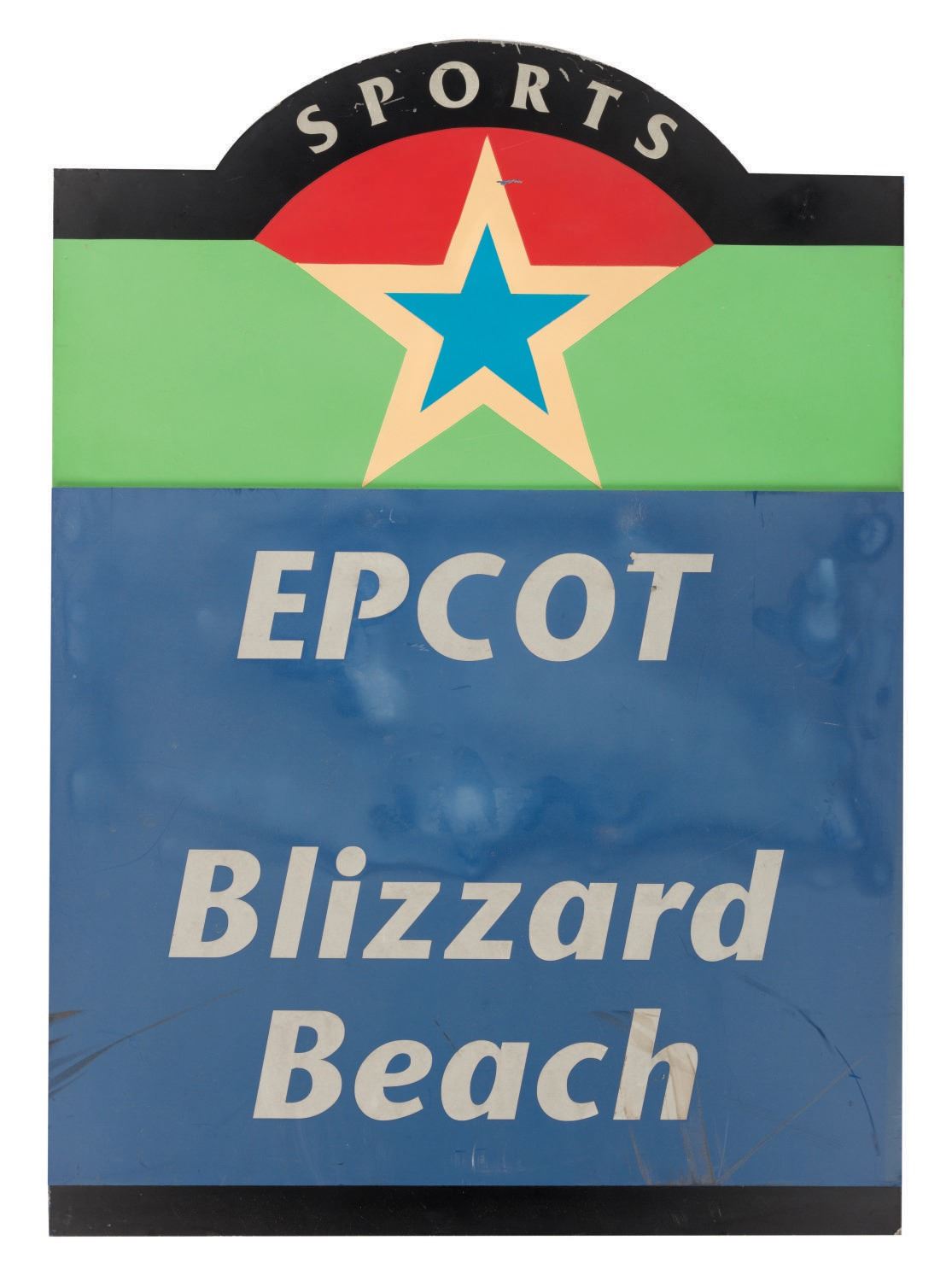 (Walt Disney World, 1990s-2000s) An All-Star Sports Resort EPCOT & Blizzard Beach Sign. The Disney Bus Transportation sign once posted near Guest Boarding areas of Disney's All-Star Sports Resort. This particular sign identified buses travelling to Blizzard Beach and EPCOT and was likely removed and replaced during a rehabilitation of the area. Measuring 34"x24", the metallic sign is in very good condition with scuffs paint chips, and wear from outdoor Resort display.