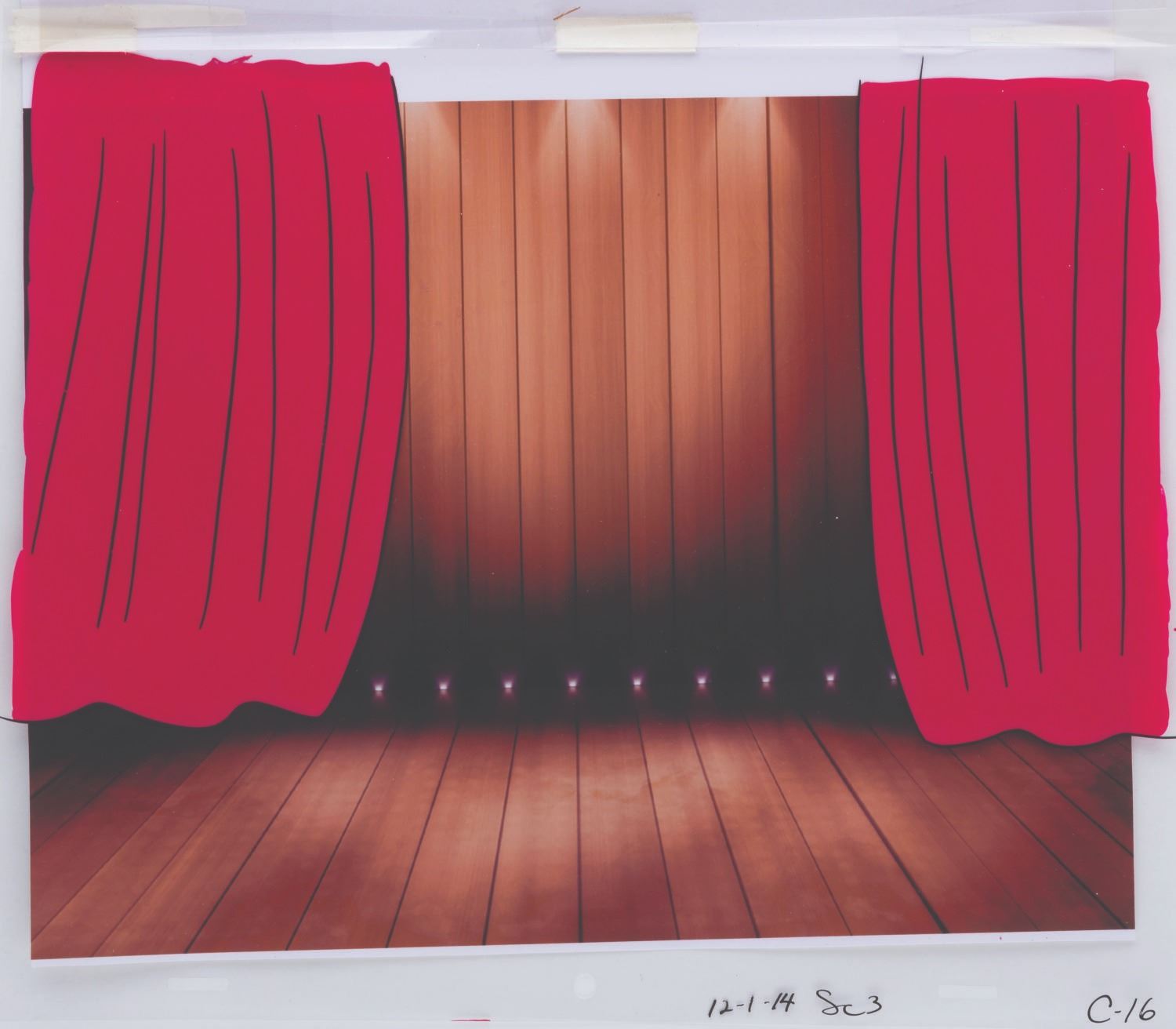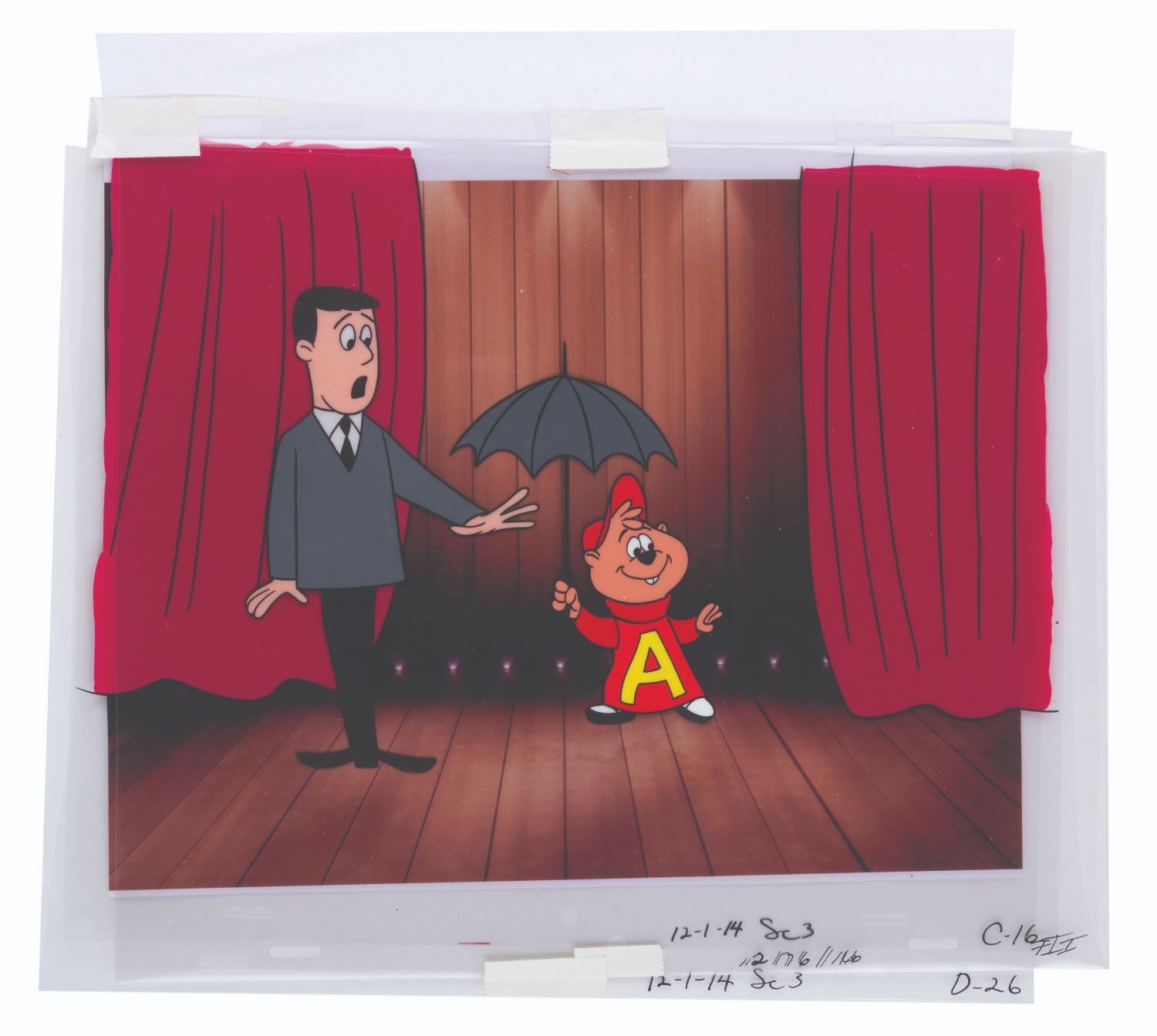 (CBS, 1961-62) An original multi-layer production cel of Alvin and David Seville from “The Alvin Show,” with a color copy background. Alvin and David have an image size of 6” x 6.25” on 10.5” x 12.5” cels. The hand-painted piece is in very good production-used condition with a spot of line loss to David’s right shoulder.