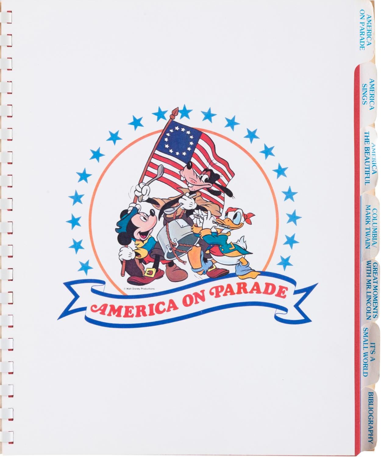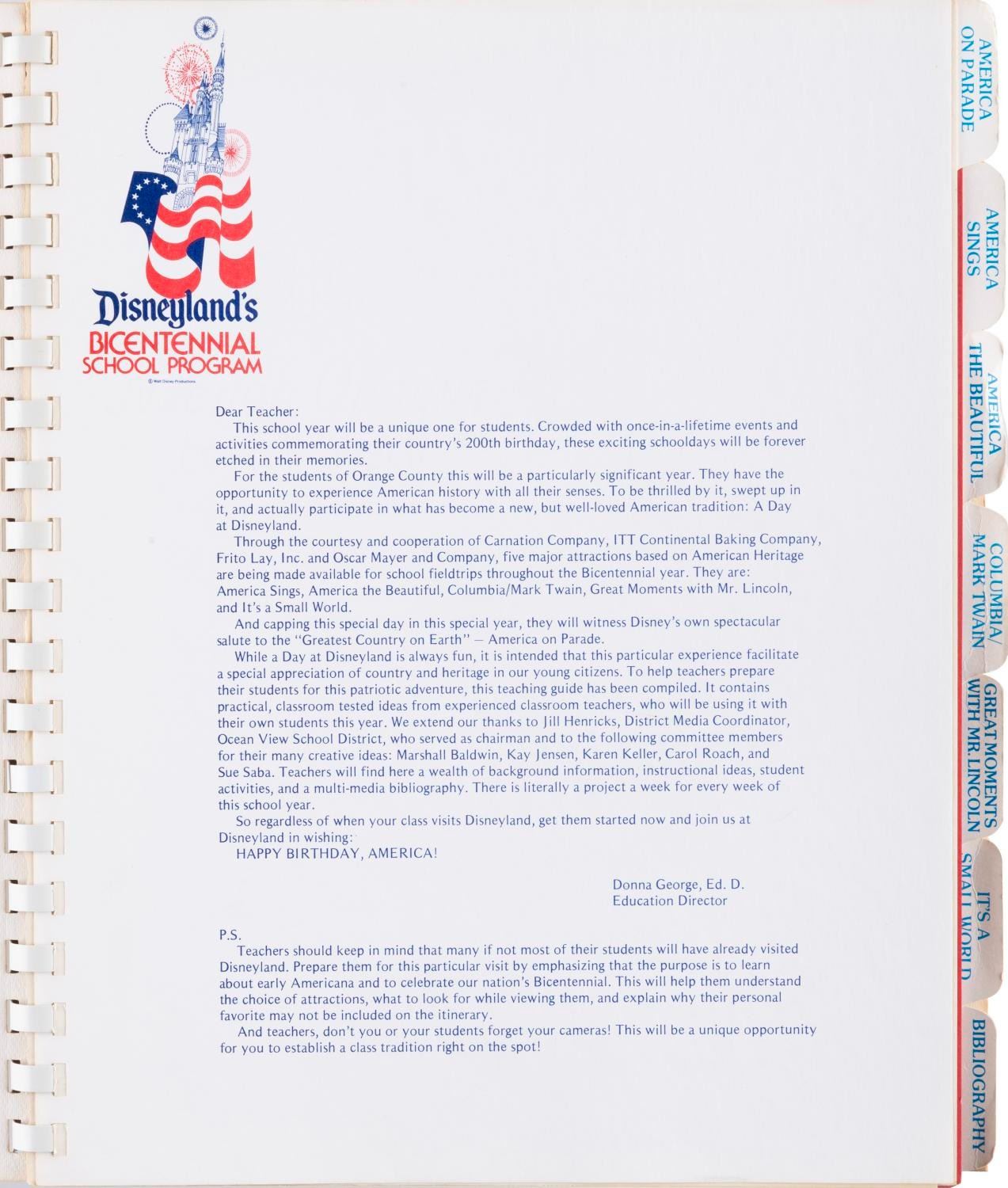 (Disneyland, 1975) A Disneyland's Bicentennial School Program containing suggested activities and information for teachers. Measuring 9.5” x 11”, the spiral-bound program is in very good condition with light wear and creases on tabs from use.