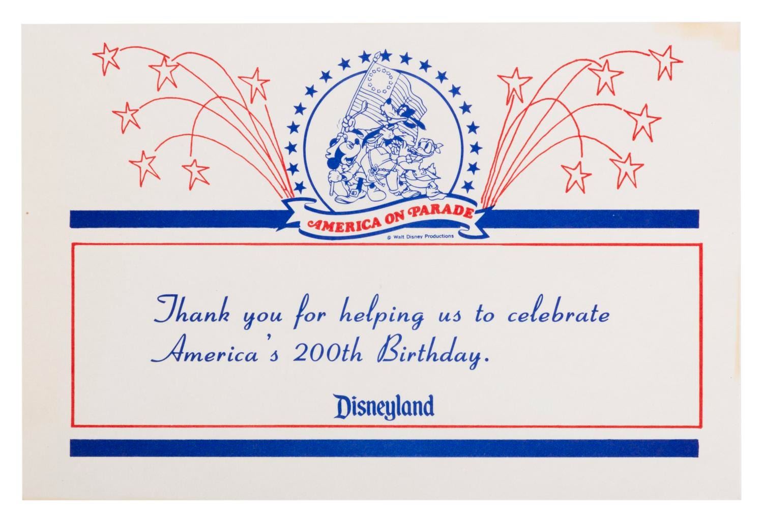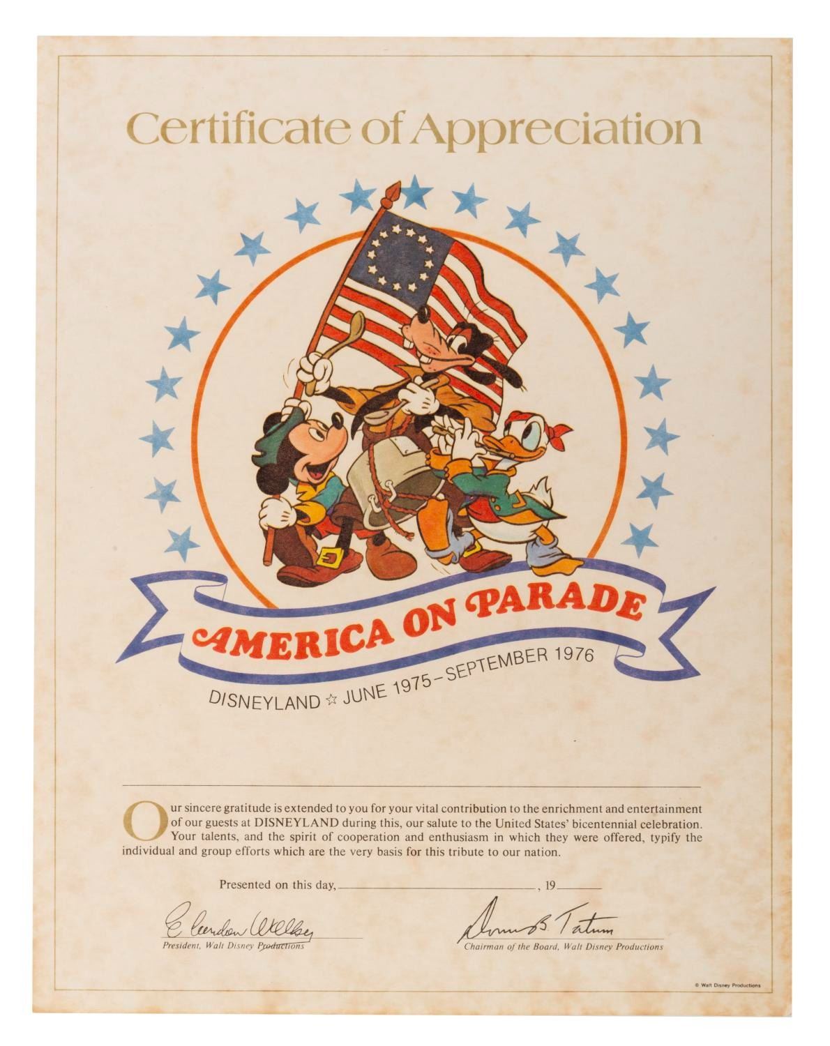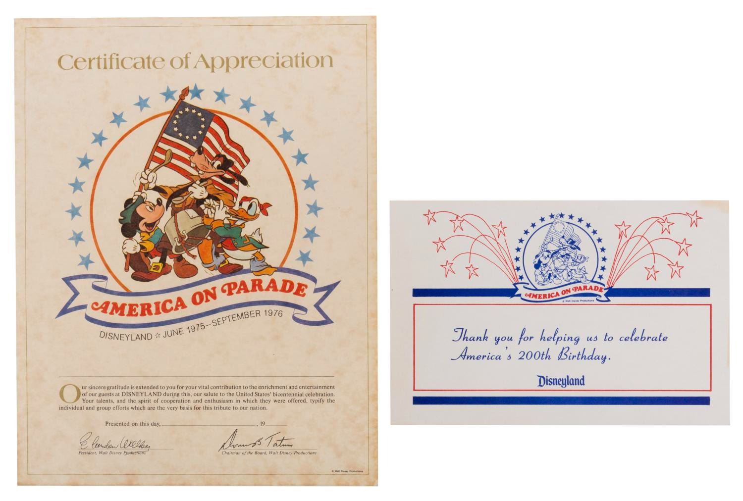(Disneyland, 1975-76) An unused Cast Member certificate of appreciation and thank you note from Disneyland's bicentennial celebration "America on Parade." The certificate measures 8.5"x11" and is in very good condition with discoloration, light edge wear, and bent corners. The thank you note measures 7.75"x5.25" and is in very good condition with edge wear and page discoloration.