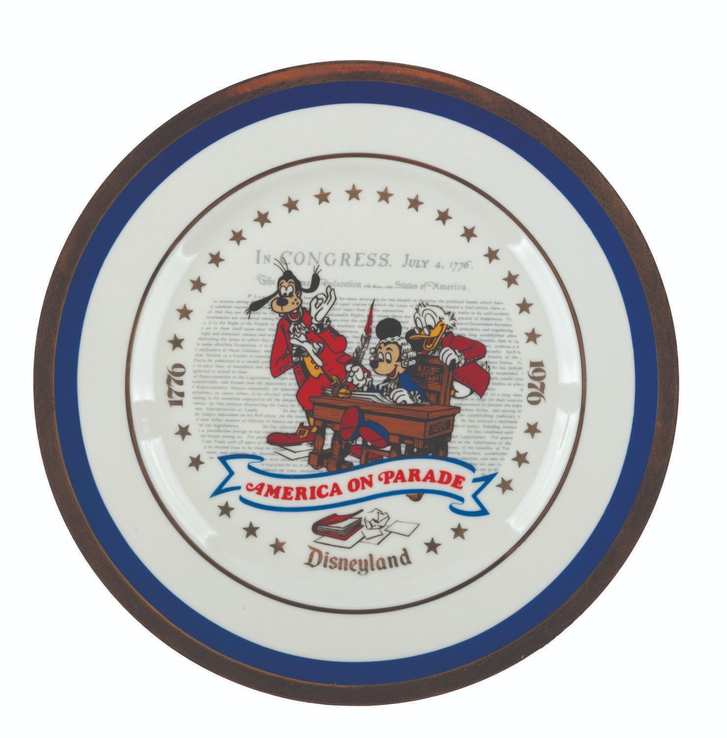(Disneyland/Walt Disney World, 1975-76) A limited edition decorative plate manufactured by Viletta from the America on Parade bicentennial celebration. The plate features Mickey signing the Declaration of Independence while Goofy and Scrooge McDuck look on. Measuring 11" in diameter the plate is in fine condition.
