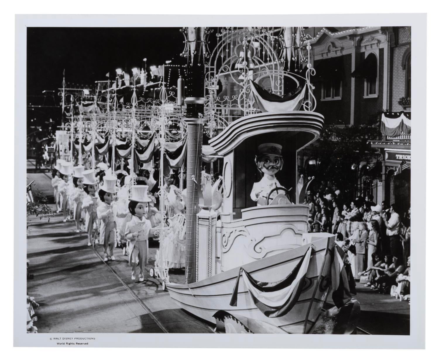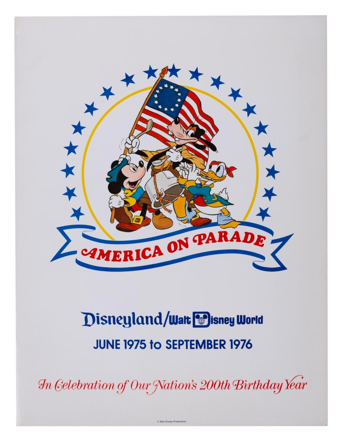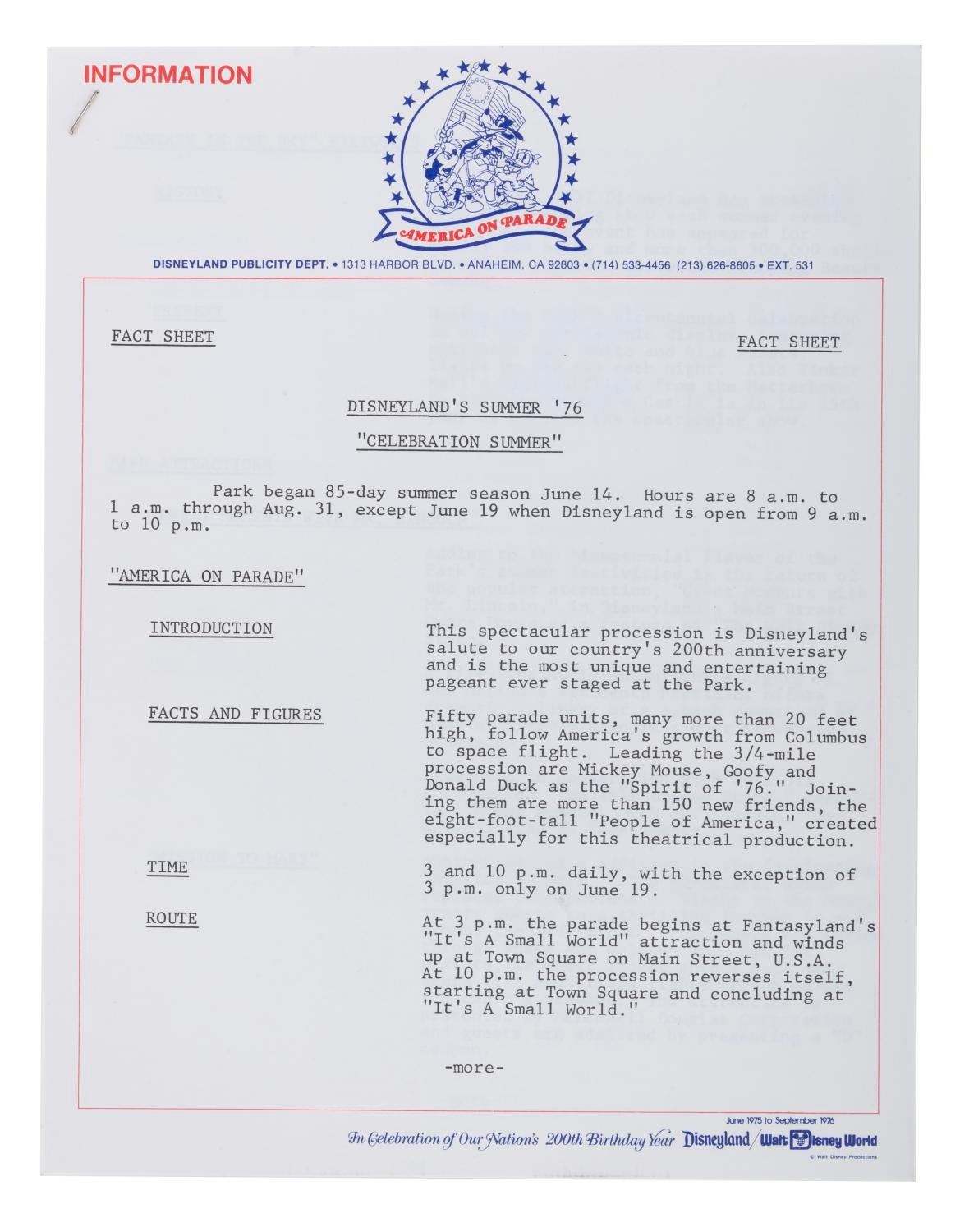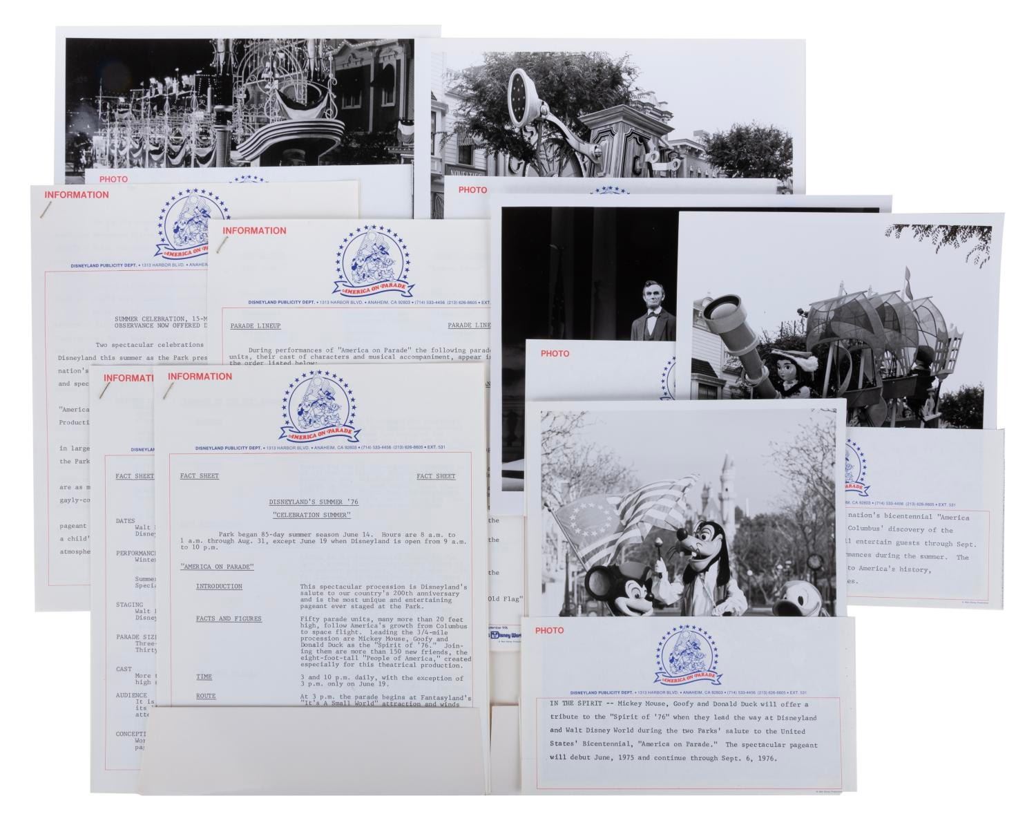 (Disneyland/Walt Disney World, 1975) A press kit for "America on Parade" celebrating the American Bicentennial and lasted from June of 1975 until September of 1976. The press kit includes two fact sheets, a parade line-up, a press release, and five 8" x 10" black and white photographs. Measuring up to 9"x12", the kit and its contents are in very good condition with light edge wear and discoloration due to age.