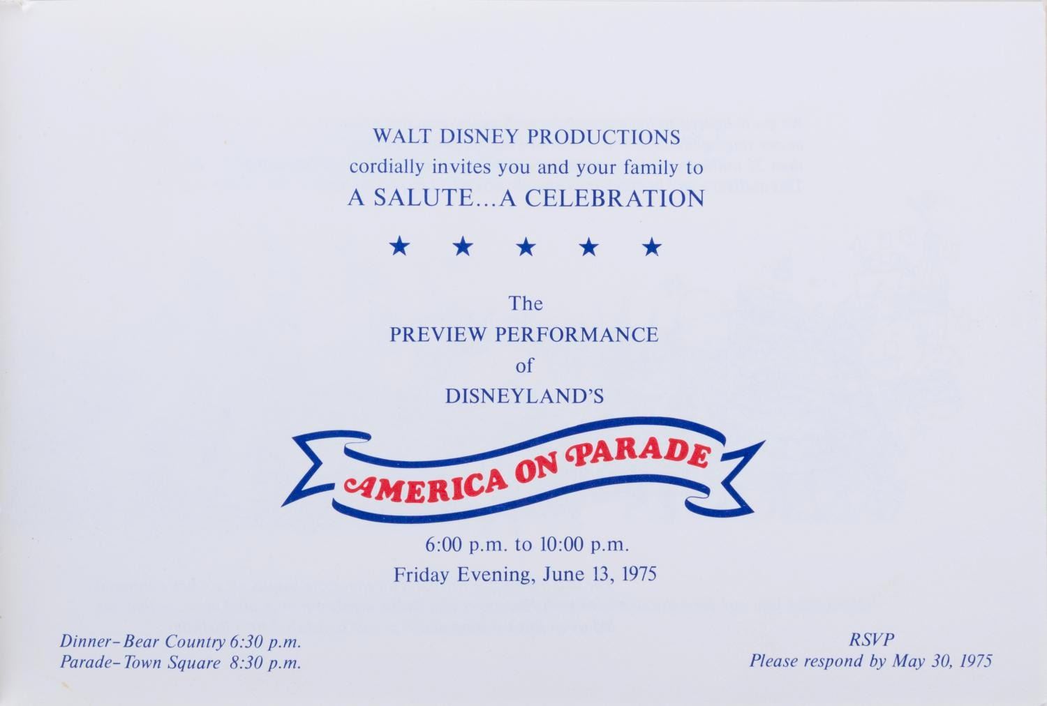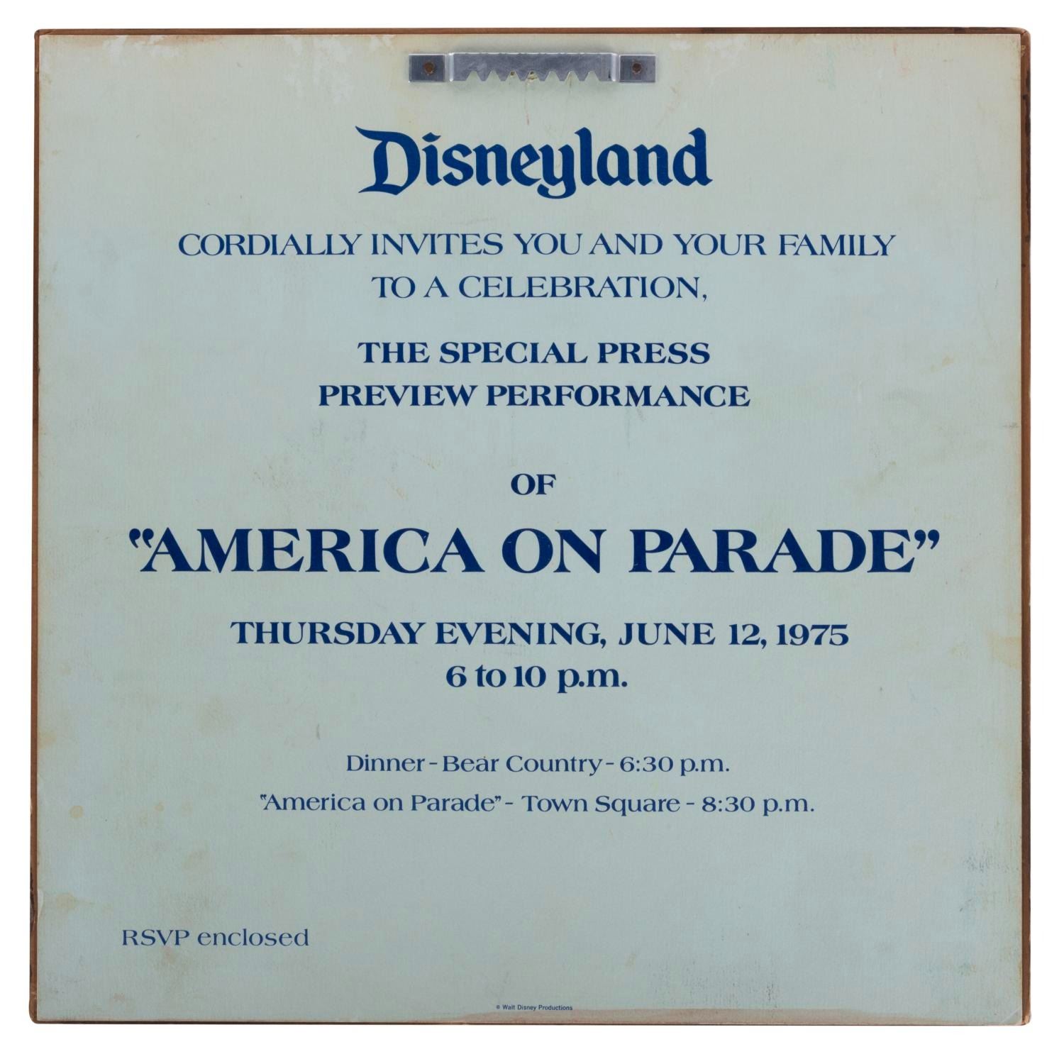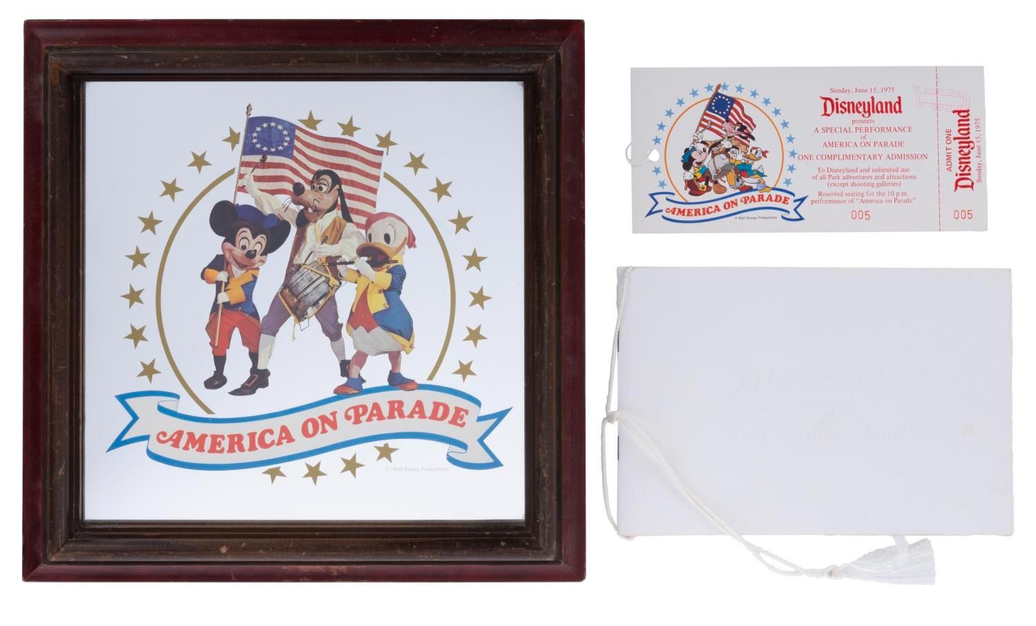 (Disneyland, 1975) A collection of tickets and invitations to opening weekend performances of Disneyland's "America on Parade" bicentennial celebration. Included are a framed "America on Parade" mirror with an invitation for a press screening on Thursday, June 12 on the reverse, a booklet and invitation to a "Special Preview" on Friday, June 13, and a Complimentary Main Gate Admission ticket for VIP seating for the "Special Presentation" of the parade on Sunday, June 15. and wear to the mirror and frame. The paper documents measure between 3.25"x4.25", and are in very good condition with light edge wear and smudging. The mirror measures 11"x11 and is in very good condition with minor surface scratches, as well as discoloration and wear to the wooden frame.