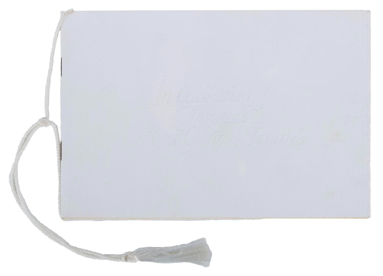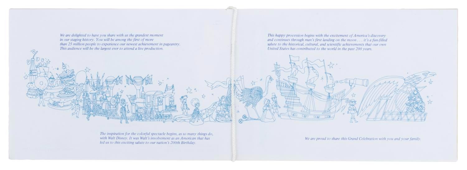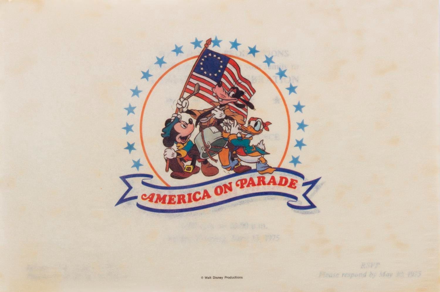 (Disneyland, 1975) A collection of tickets and invitations to opening weekend performances of Disneyland's "America on Parade" bicentennial celebration. Included are a framed "America on Parade" mirror with an invitation for a press screening on Thursday, June 12 on the reverse, a booklet and invitation to a "Special Preview" on Friday, June 13, and a Complimentary Main Gate Admission ticket for VIP seating for the "Special Presentation" of the parade on Sunday, June 15. and wear to the mirror and frame. The paper documents measure between 3.25"x4.25", and are in very good condition with light edge wear and smudging. The mirror measures 11"x11 and is in very good condition with minor surface scratches, as well as discoloration and wear to the wooden frame.