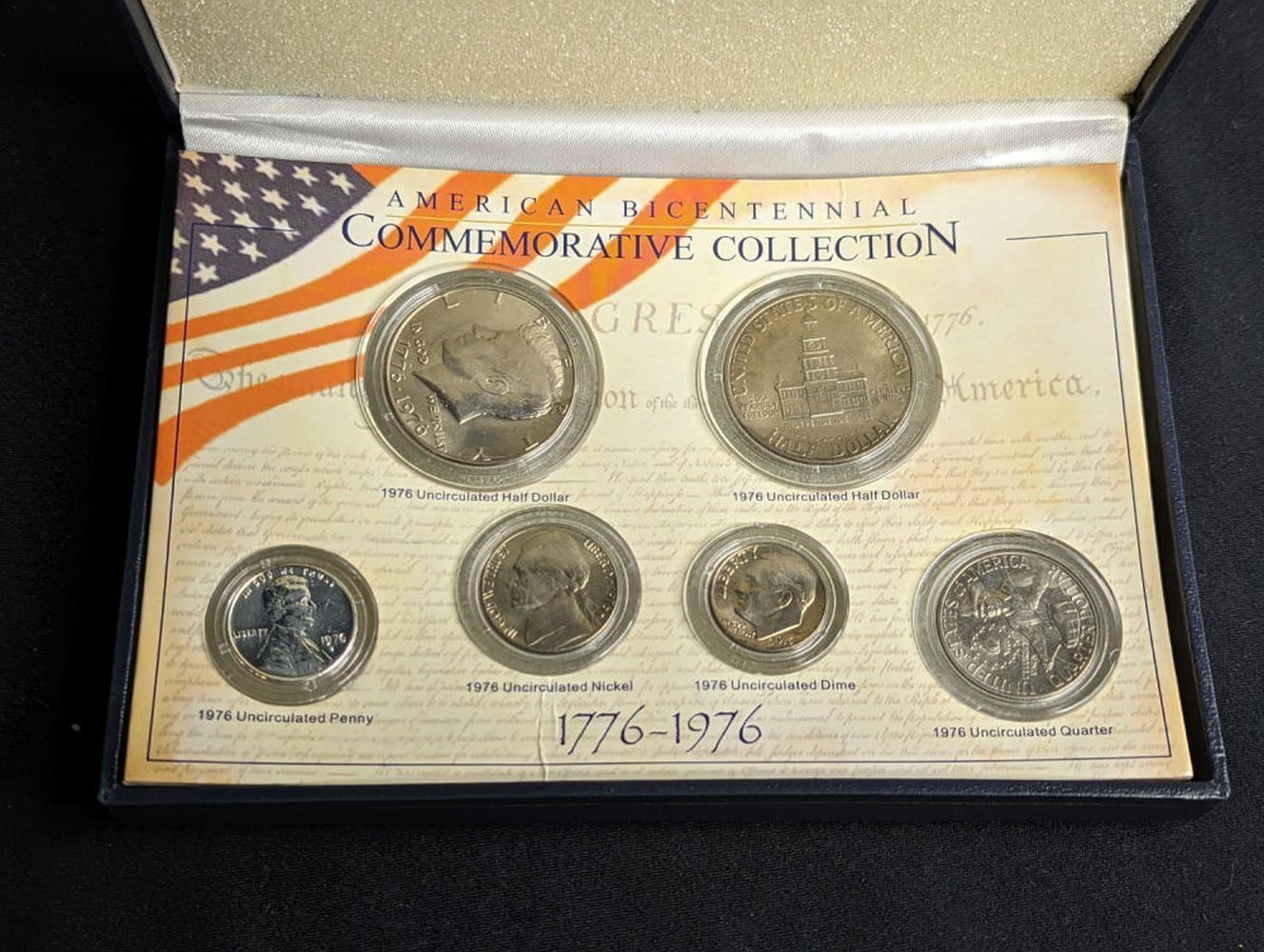 An American Bicentennial Commemorative Mint Set 1776-1976 With two Half Dollars, Quarter , Nickel , Dime and Cent