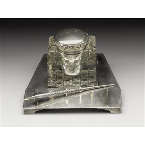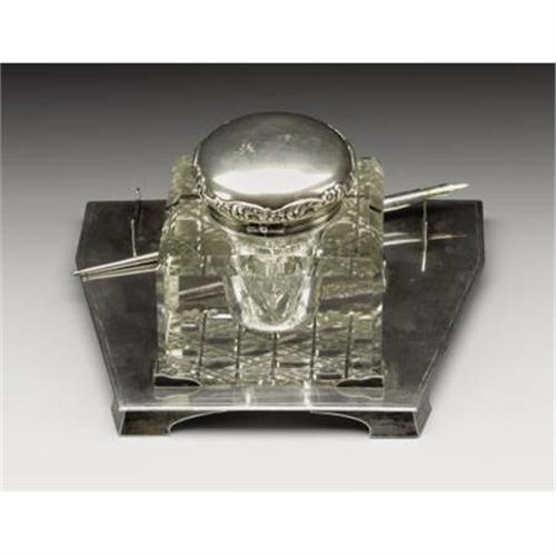 <B>An American Glass and Silver Inkwell and Tray</B></I><BR><BR>Dominick & Haff, New York, New York (Inkwell)<BR>Wm. B. Kerr, Newark, New Jersey (Tray)<BR>Retailed by Tiffany & Co., New York, New York<BR>Circa 1890-1912<BR>Silver and glass<BR>Marks: (Dominick & Haff), <I>STERLING PATENT, 134</B></I>; (Wm. B. Kerr), <I>STERLING, D1289, MADE FOR TIFFANY & CO.</B></I><BR>4 in. high<BR><BR>The inkwell of large squared shape with bevel edges and diamond cut bottom, silver bezel and top with embossed scroll and flower decoration; the tray of trapezoidal form on bracket feet, with bracket holders for inkwell and pens, inscribed <I>1912.</B></I> With associated silver pen.<BR><BR><b>Shipping:</b> Requires 3rd Party Shipping (<a target="_blank" href="http://www.heritageauctions.com/common/shipping.php">view shipping information</a>)