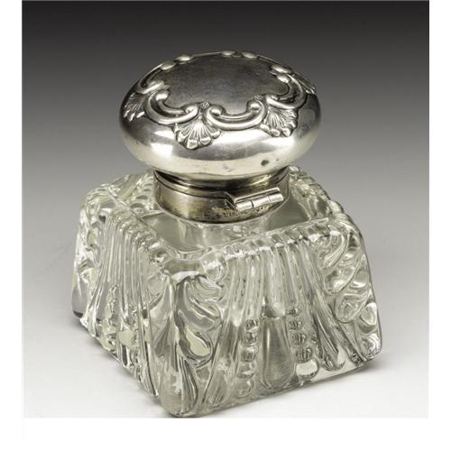 <B>An American Glass and Silver Inkwell</B></I><BR><BR>Gorham Manufacturing Company, Providence, Rhode Island<BR>1894<BR>Molded glass and silver<BR>Marks: (lion-anchor-G), <I>STERLING S1942,</B></I> (1894)<BR>3.37 in. high<BR><BR>The tapering square molded glass base with leaf corners and fluted sides with silver bezel and cap with embossed scroll and shell decoration.