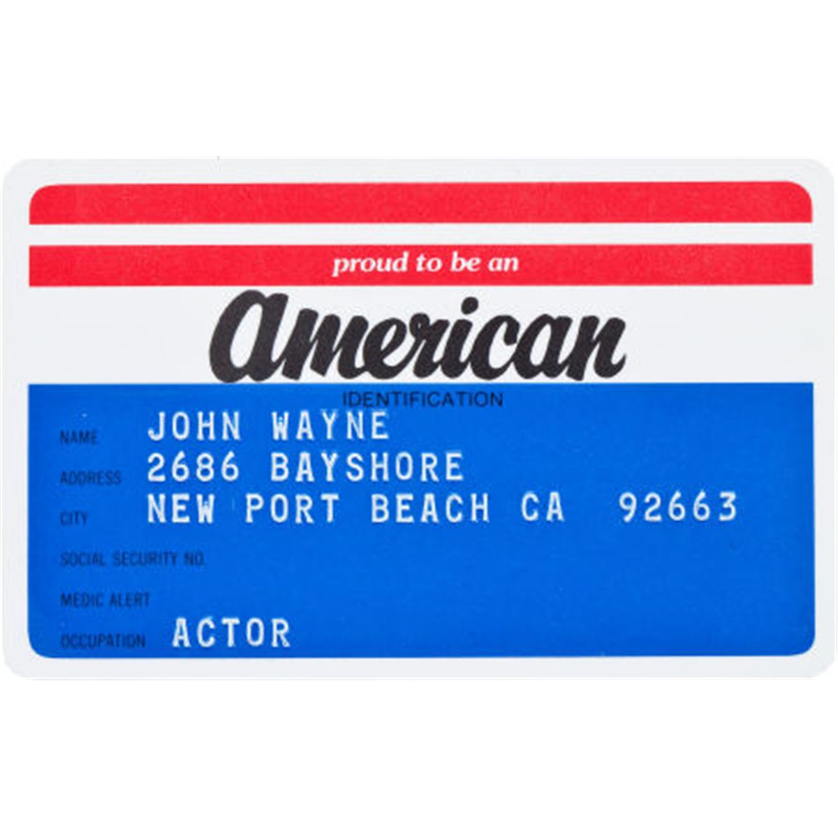 An 'American' ID Card, 1970s. Text on front of card notes "proud to be an American," embossed with Wayne's name, Newport Beach address, and profession, text on back is the Pledge of Allegiance; included is the card's original backing; likely ordered from a catalogue as was Wayne's habit.2" x 3 1/2"