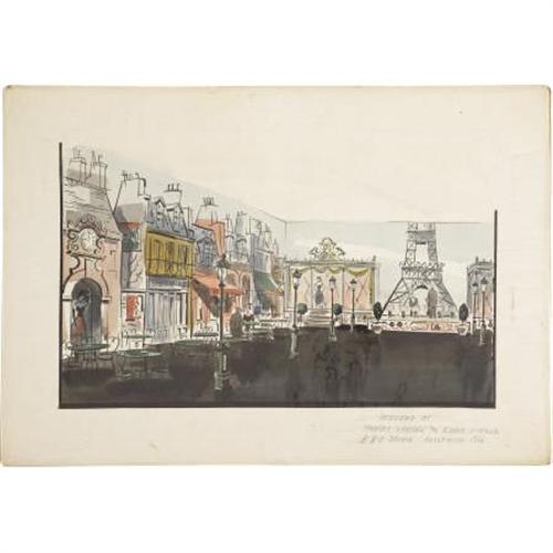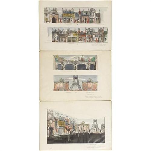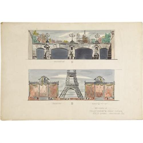 <B><I>An American In Paris</B></I></B></I> <B>Original Set Design Sketches.</B></I> Directed by Vincente Minnelli with choreography by Gene Kelly, the Academy Award-winning musical <I>An American in Paris</B></I> (1951) represents a high point in both men's careers thanks to exquisite production values and showstopping, creative flair (especially the 18-minute ballet climax). This attractive set features three illustration boards with a total of five detailed pencil-and-watercolor set designs for the movie, by artists Charles Ohmann and Edgar Kiechle. Each measures 24" x 17" and is in Very Fine condition with mild soiling and some light wear to the edges and corners.<BR><BR><b>Shipping:</b> Flat Material, Large (<a target="_blank" href="http://www.heritageauctions.com/common/shipping.php">view shipping information</a>)