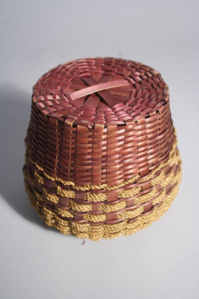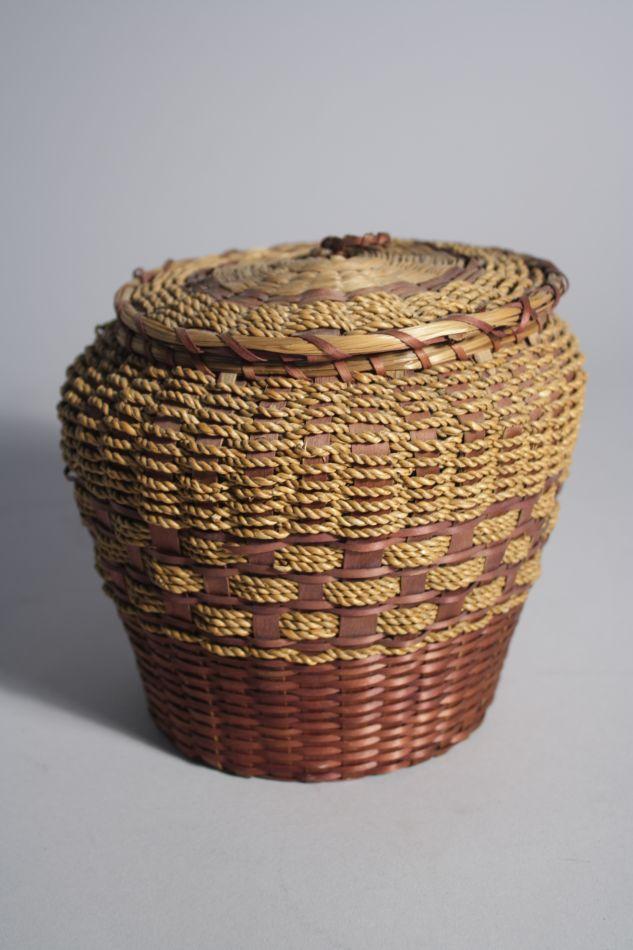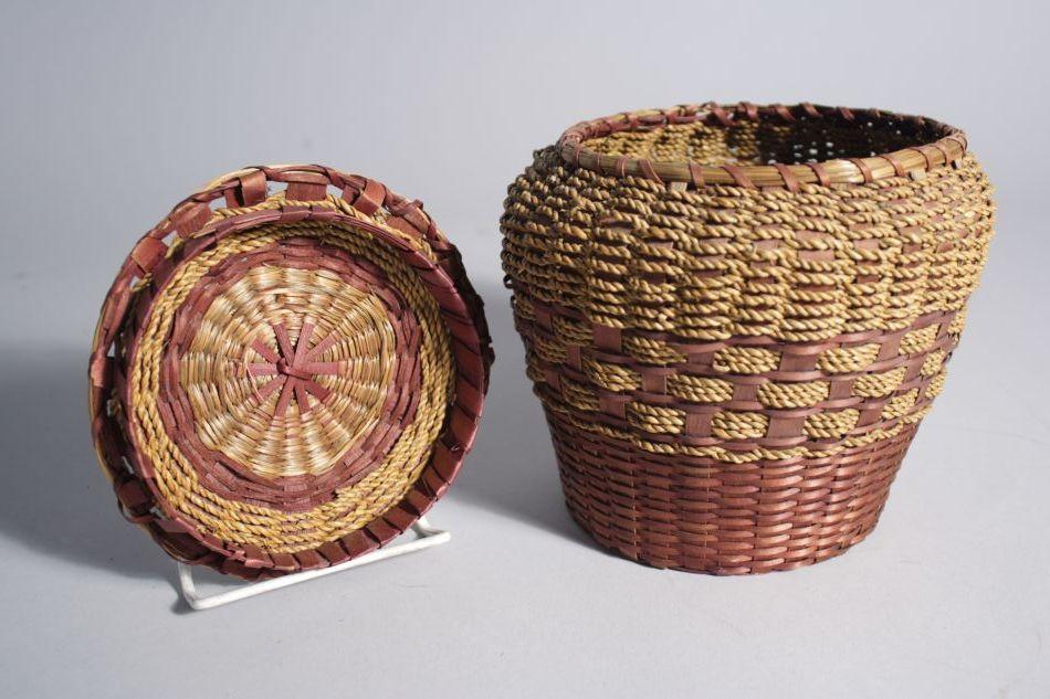 An American Indian Coiled and Woven Lidded Basket with Colored Decoration.