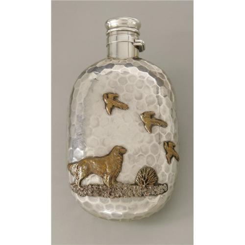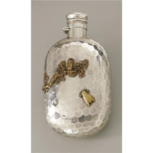 <B>An American Mixed Metal Flask</B></I><BR>Gorham Manufacturing Company, Providence, RI, 1882<BR><BR>The sterling oval flask with hammered body and unique mixed metal depiction of animals and insects in nature to both obverse and reverse, monogram to top of hinged cap <I>MH,</B></I> <I>Gorham</B></I> date mark for 1882 and maker's hallmark to underside<BR> 1 Items <BR><BR><B>Condition Report:</B> Normal signs of wear with age