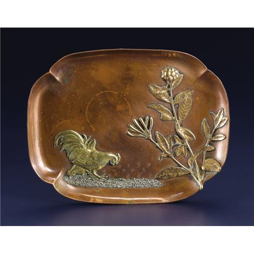 <B>An American Mixed Metal Smoking Tray</B></I><BR><BR>Gorham Manufacturing Co., Providence, Rhode Island<BR>1880<BR>Copper, brass, bronze and silver<BR>Marks: (lion-anchor-G), <I>B74, M</B></I><BR>.63 inches high x 8.63 inches wide x 6.75 inches diameter<BR><BR>Of shaped rectangular form, the copper tray with brass roosters on silver textured ground and bronze oriental flowers. <B>Condition Report:</B> wear and staining to surface<BR><BR><b>Shipping:</b> Requires 3rd Party Shipping (<a target="_blank" href="http://www.heritageauctions.com/common/shipping.php">view shipping information</a>)