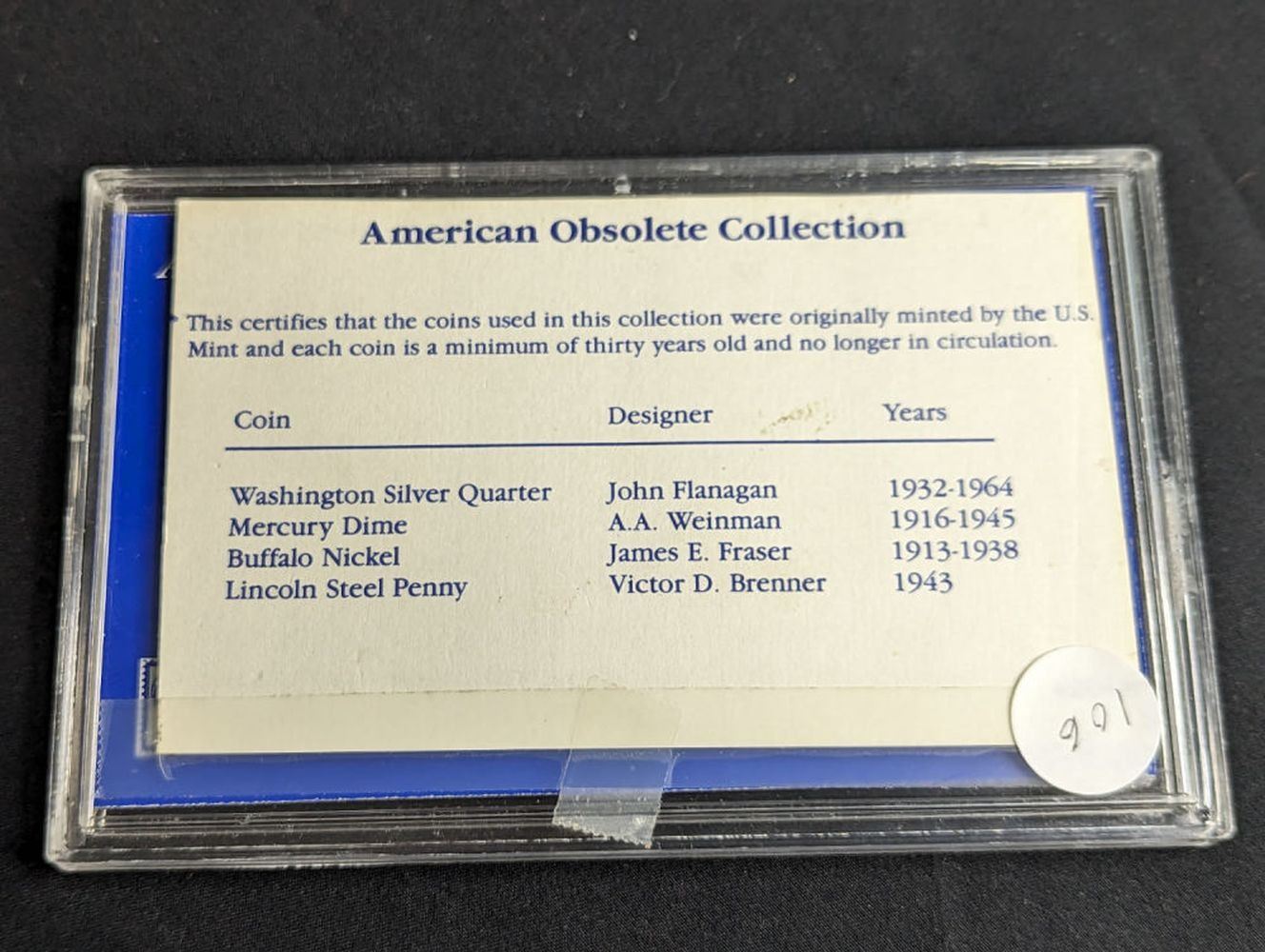 An American Obsolete Coins Collection Featuring the Washington Quarter, Buffalo Nickel, Mercury Dime and Lincoln Steel Wheat Penny In Lucite holder