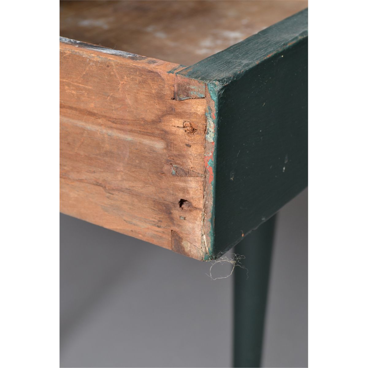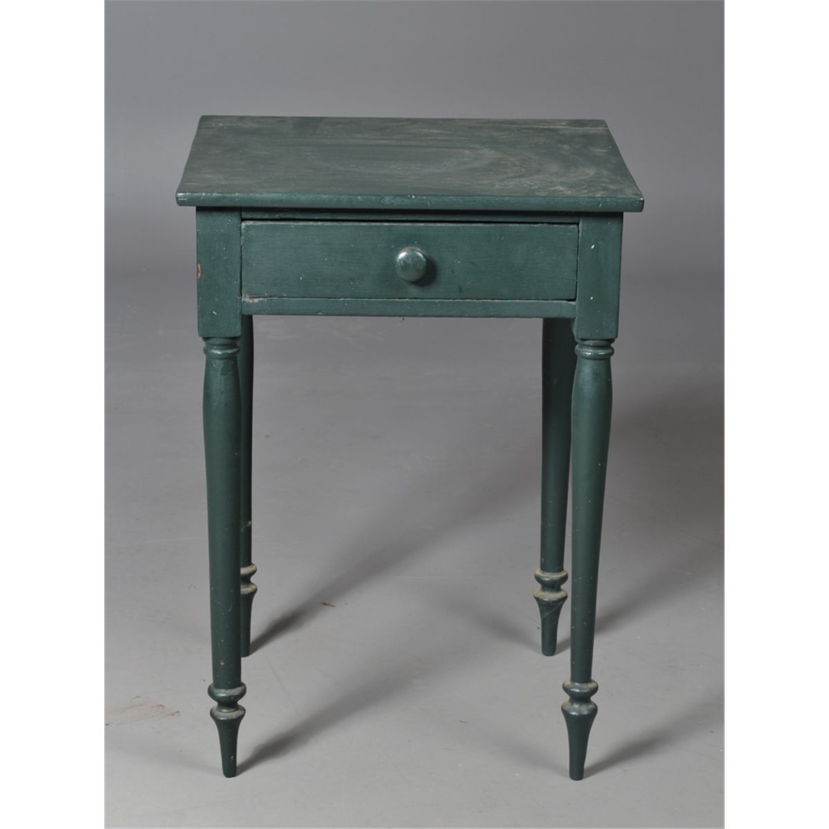 With one drawer with fine cut dovetails and turned wooden knob, with finely turned legs and old green paint. 28.5" H x 20" W x 17" D. Circa late 19th century. Private collection Gregory, MI.