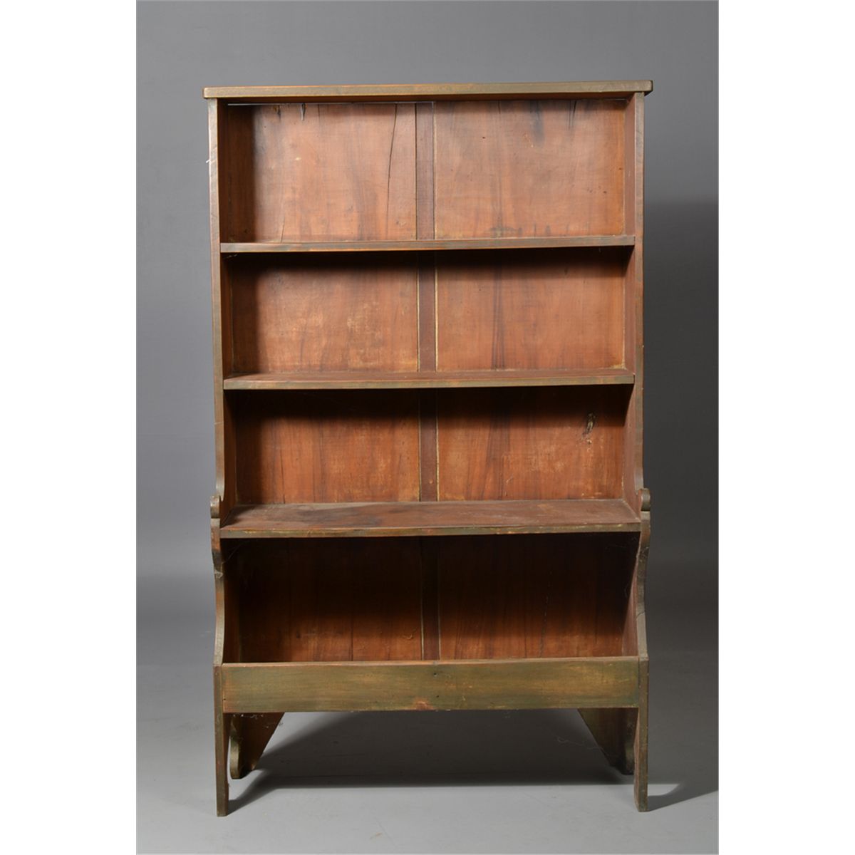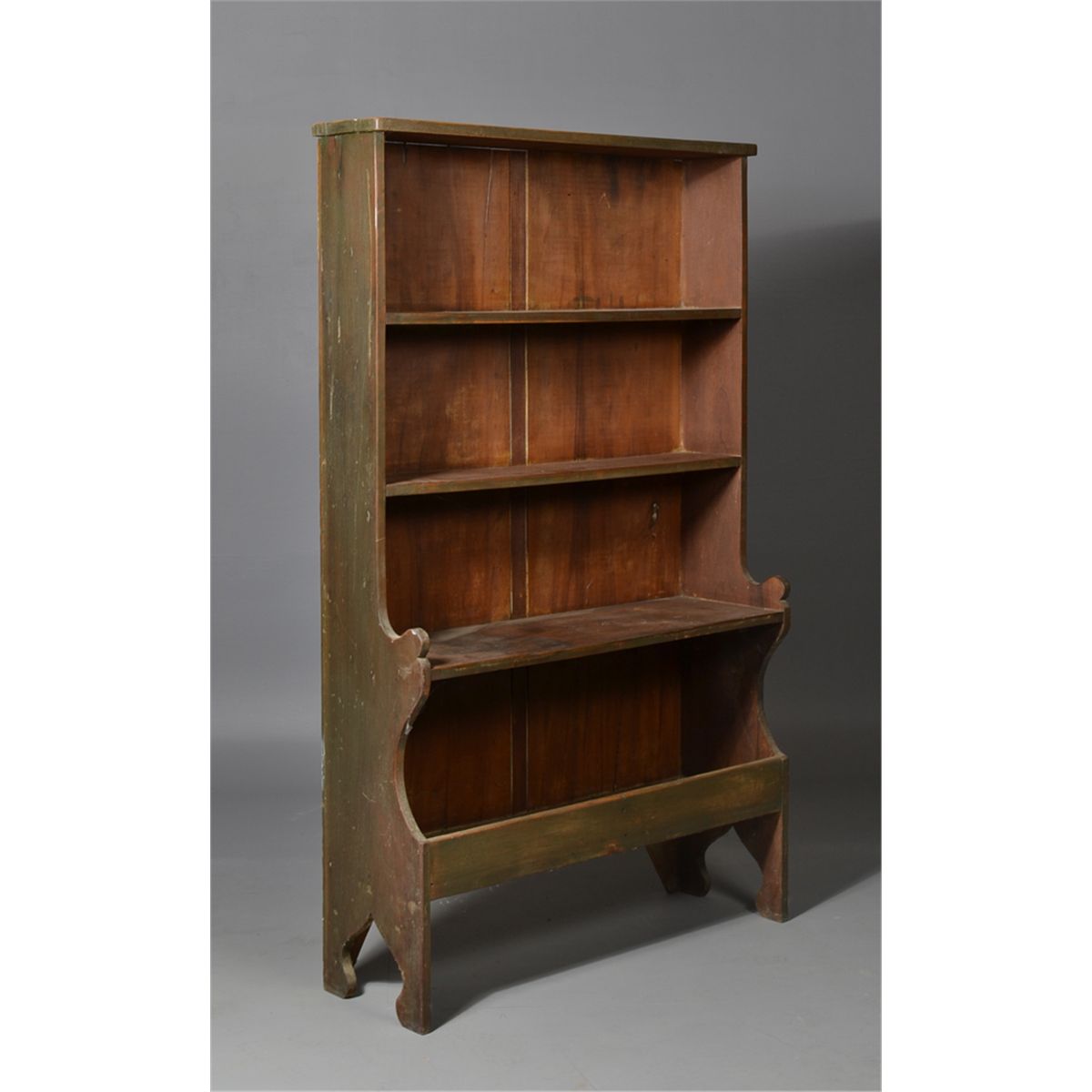 With three graduating shelves, with cut out ends and boot jack legs, in old if not original green paint. 67" H x 40" W x 12" D. Circa 19th century. Private collection Gregory, MI.