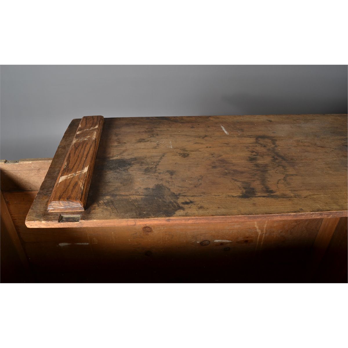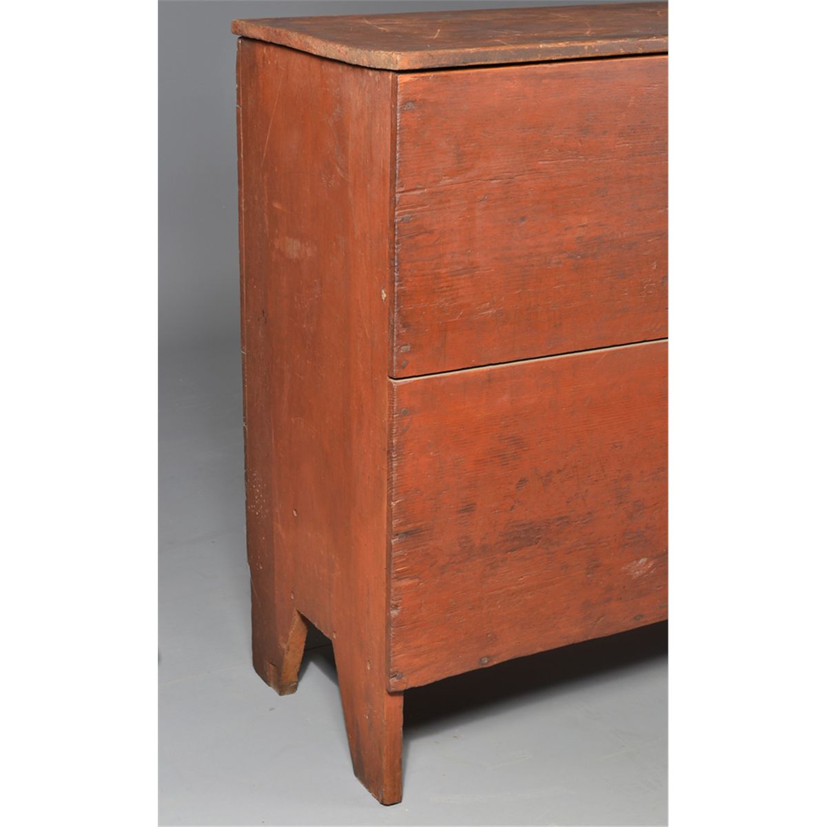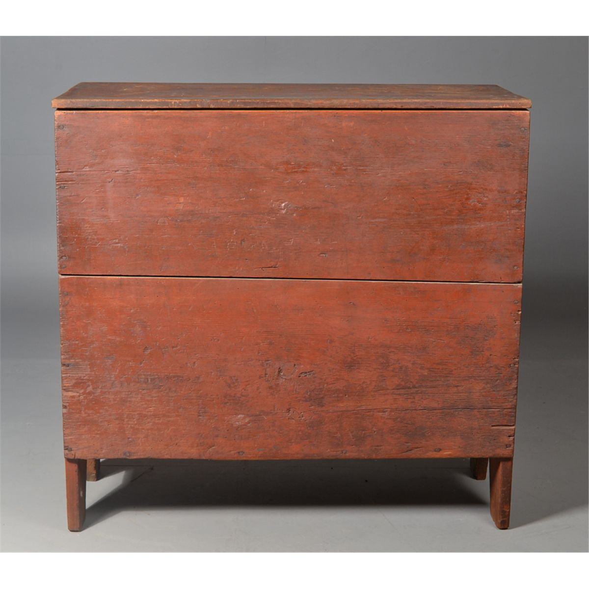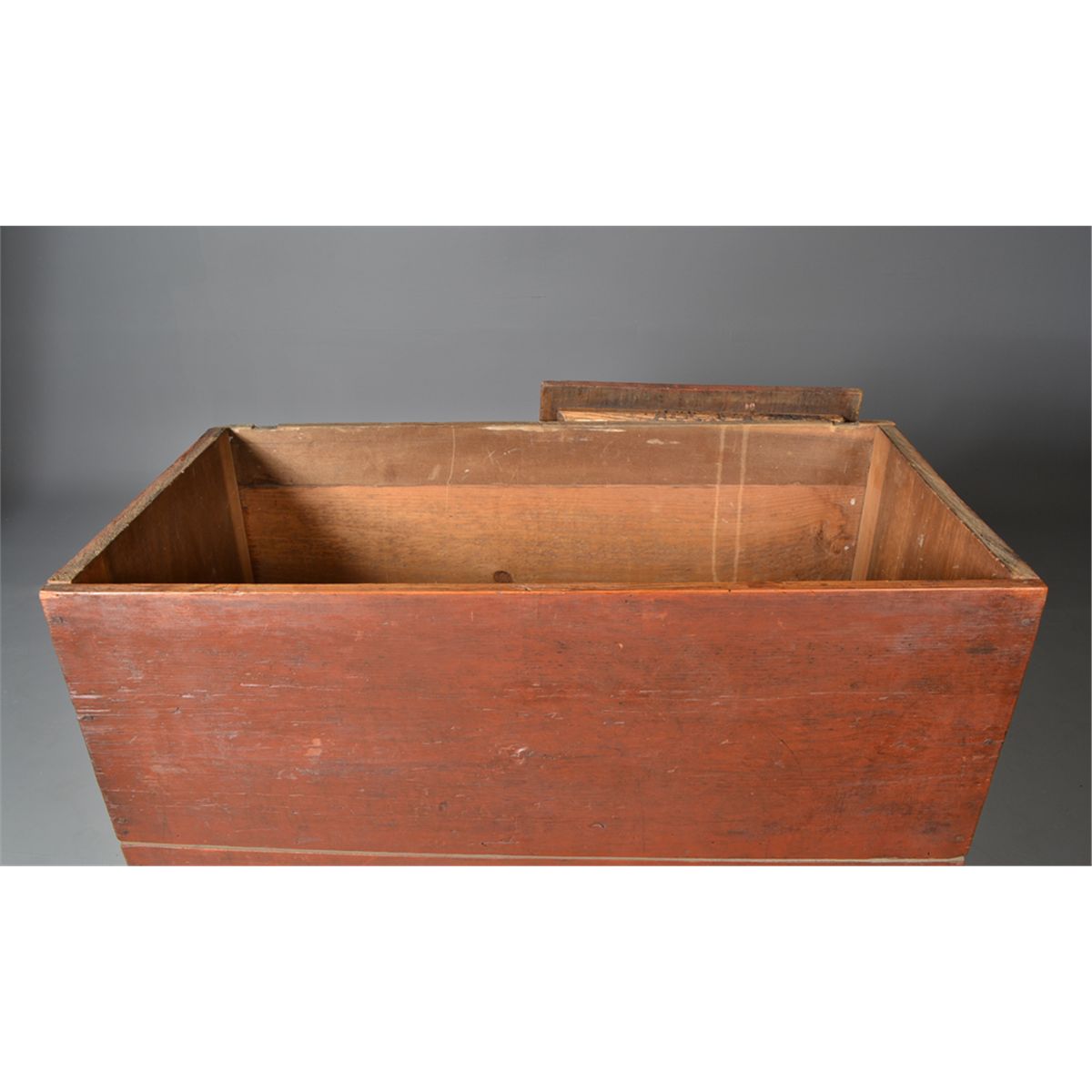 With lift off lid and boot jack feet, in original red wash stain. 40" H x 40.5" W. Probably lacking hinges for lid. Circa 19th century. Private collection Gregory, MI.
