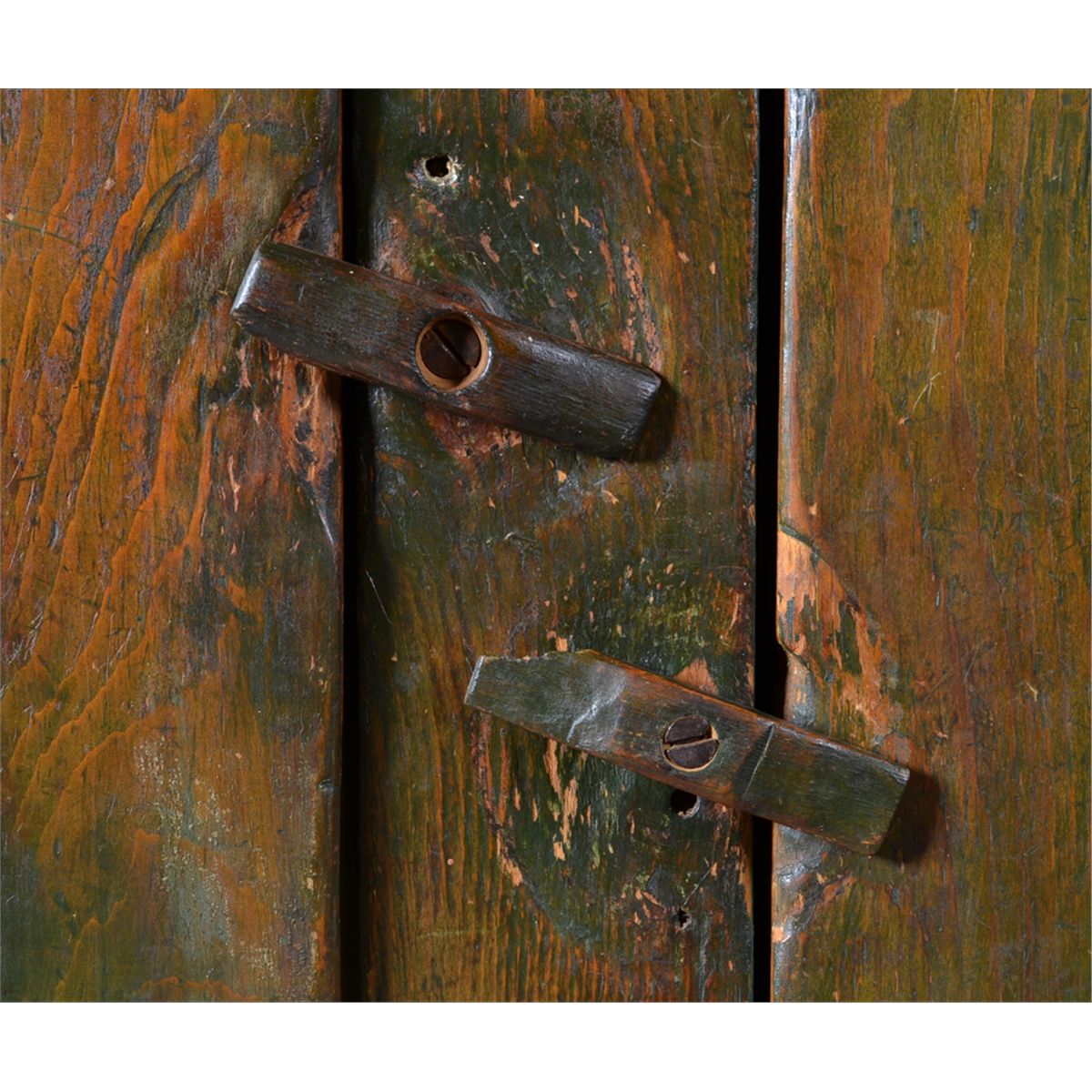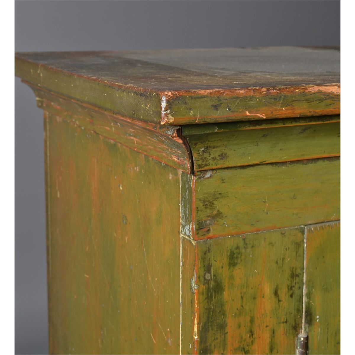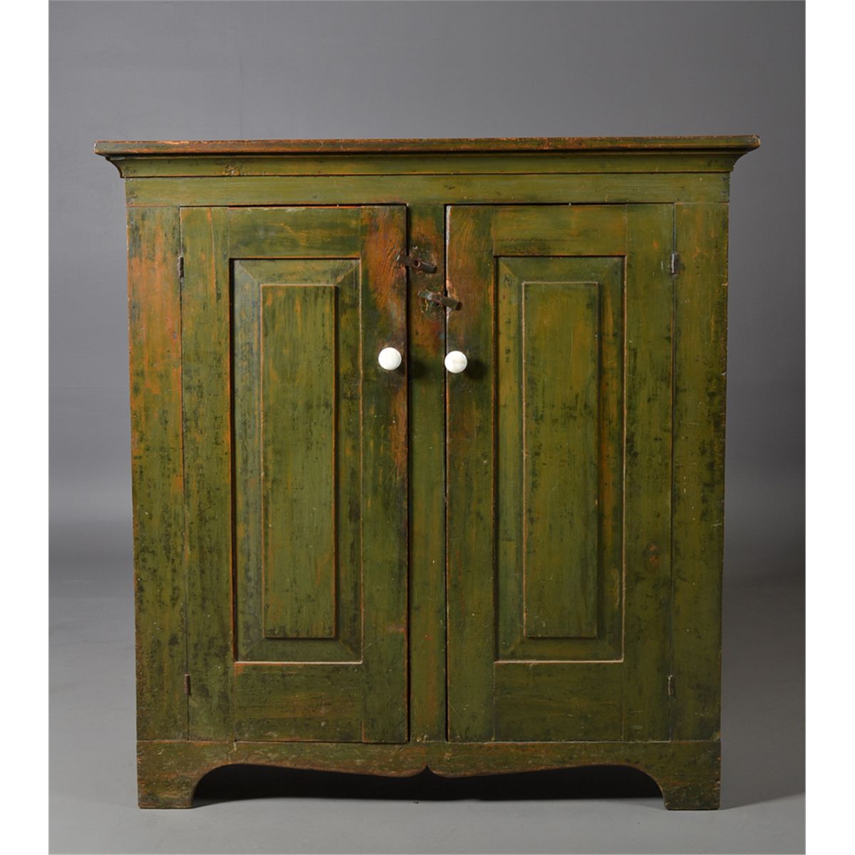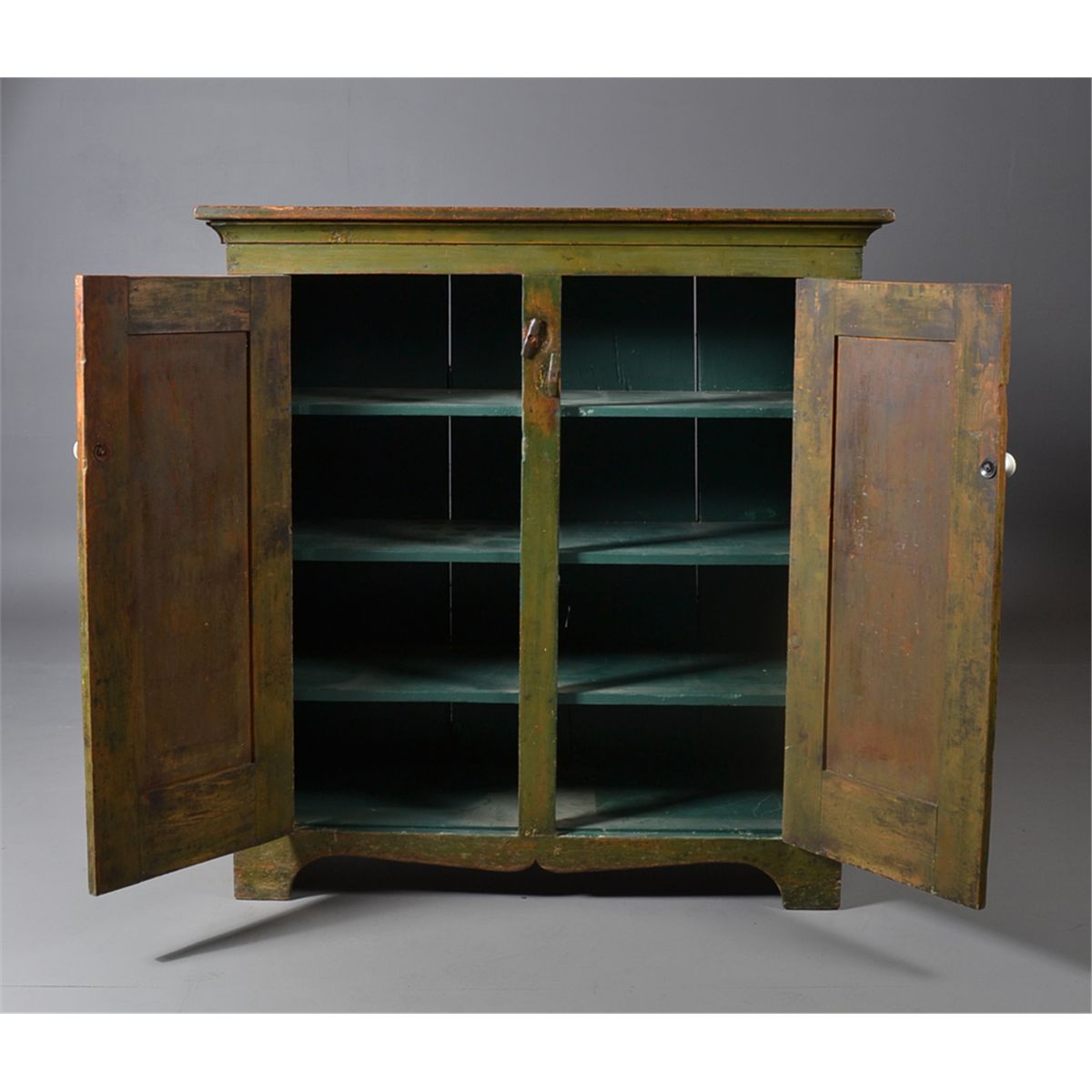 With large molded cornice over two doors opening to a shelved interior, the doors with recessed panels, resting on bracket feet. Old if not original green paint, with white porcelain knobs. 55" H x 52" W x 19" D. Circa early 19th century. Private collection Gregory, MI.