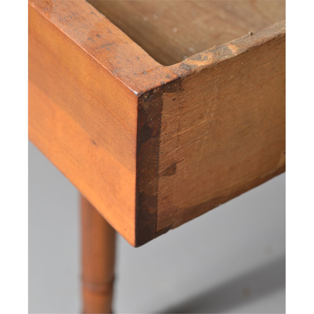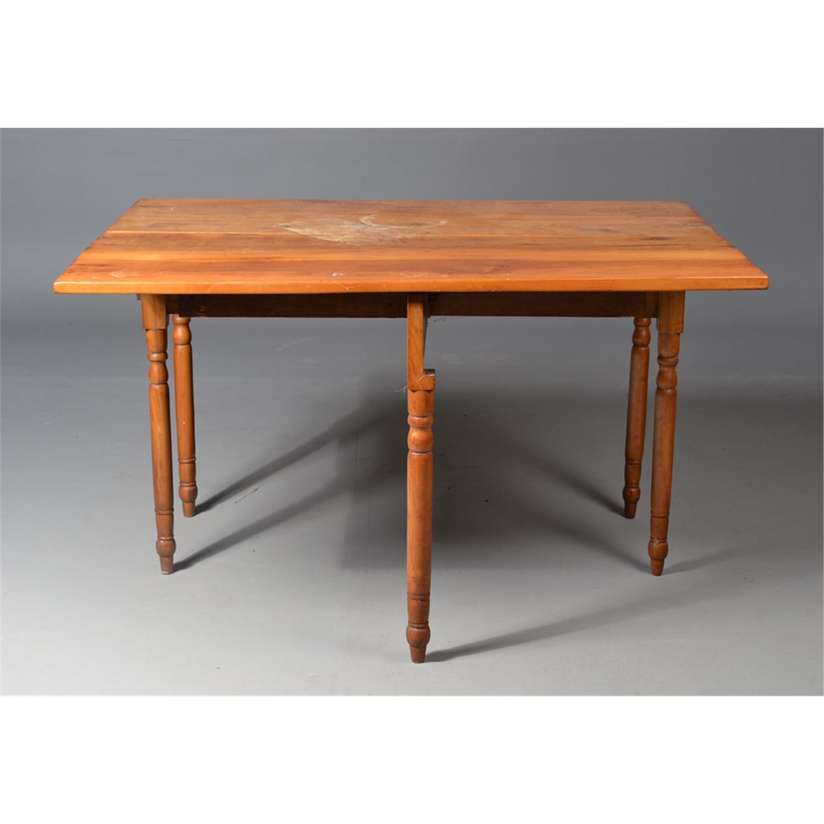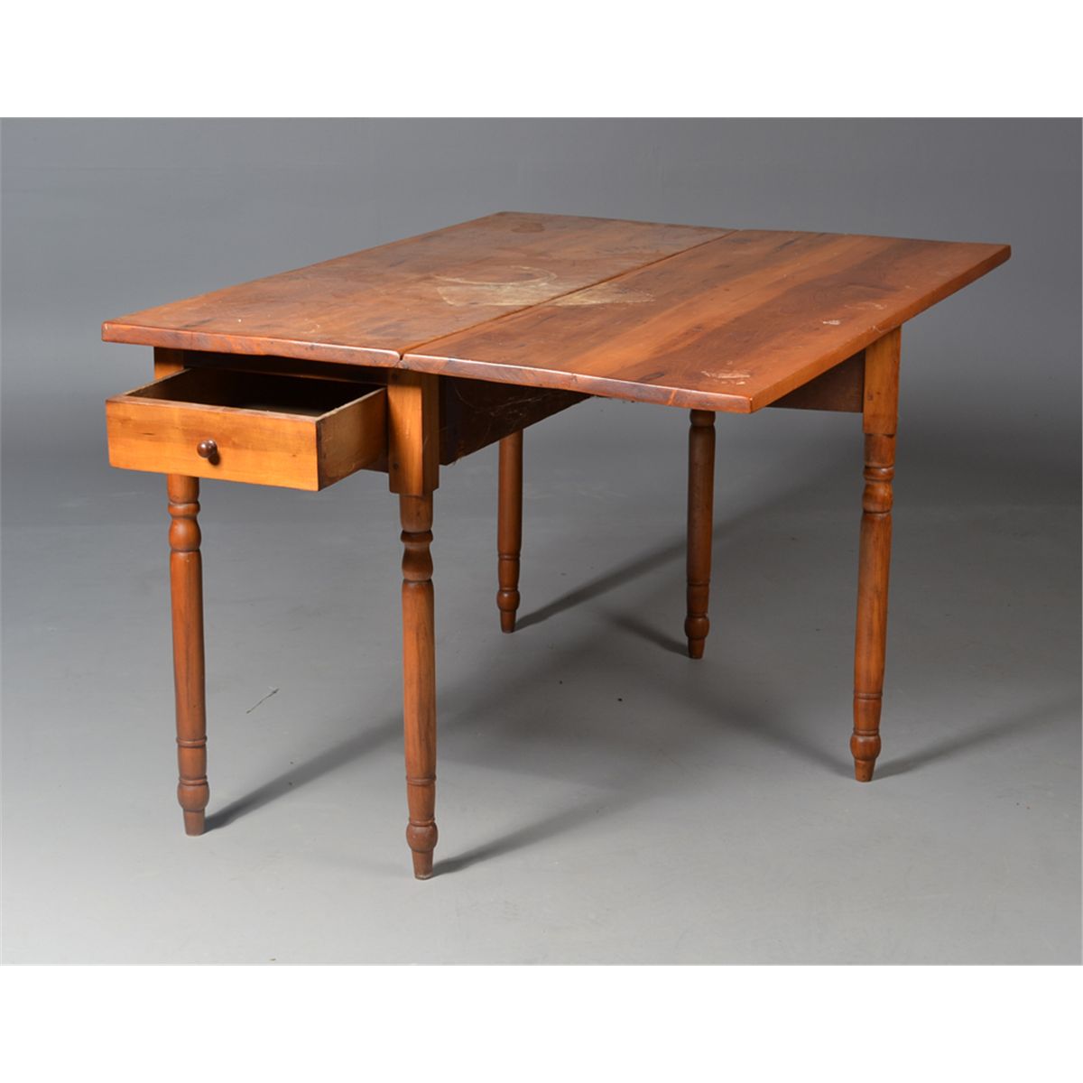 With one dovetailed with turned wood knob, with five turned legs with one to support single drop leaf, in pegged construction. With original surface. 29.5" H x 48" L x 35" D. Circa 19th century. Private collection Gregory, MI.