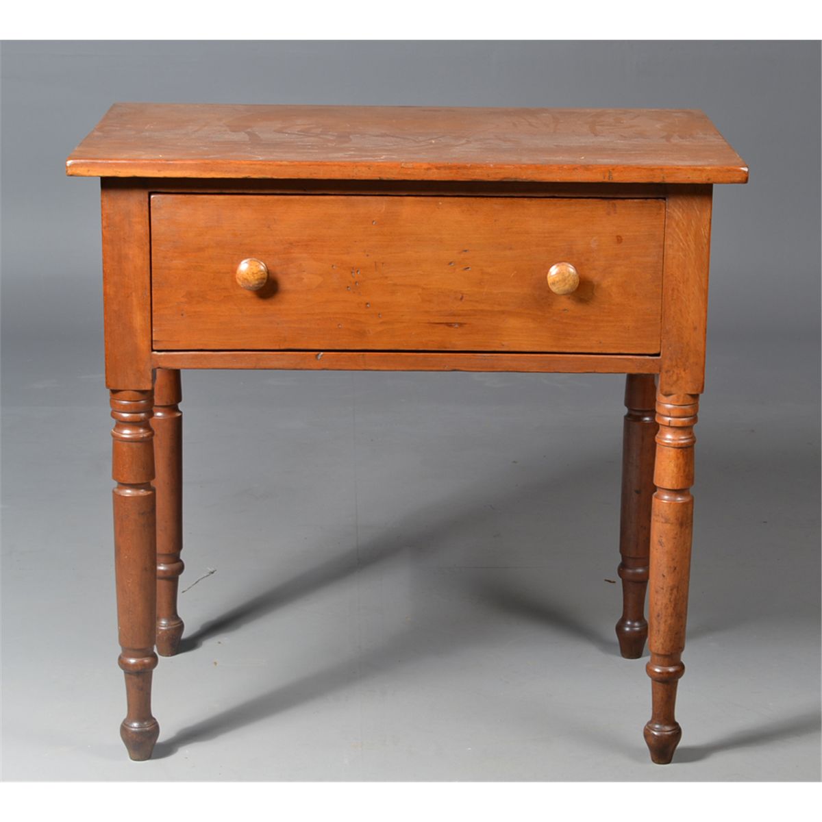 A large stand with one drawer with fine cut dovetails and turned wooden pulls, the legs with ring and vase turnings, in old if not original varnished surface. 32.5" H x 33" W. Circa 19th century. Private collection Gregory, MI.