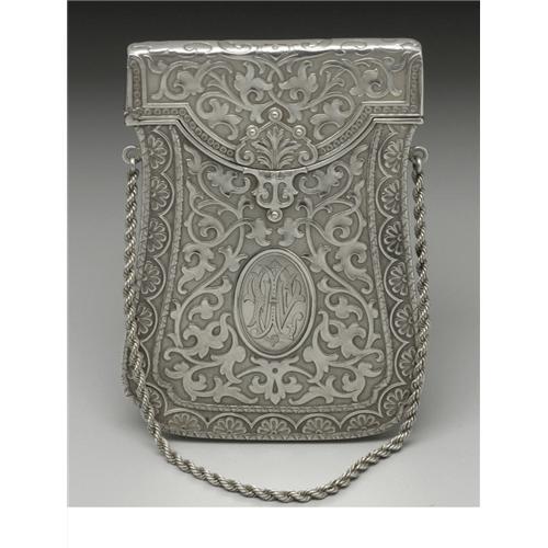 <B>An American Silver Calling Card Case</B></I> <BR><BR>Unkown maker, American<BR>Late Nineteenth/Early Twentieth Century<BR>Silver<BR>Marks: <I>STERLING 35</B></I><BR>3.75 in. long, 2.09 troy ounces<BR><BR>In the form of a purse, with embossed foliate scroll patterning. Monogrammed <I>XFW.</B></I> Suspended on a chain. In a fitted case marked <I>C. Hartdegen & Co., Newark, N.J.</B></I>