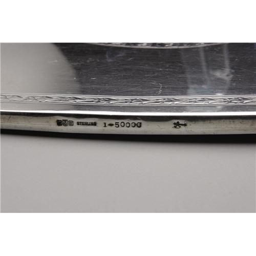<B>An American Silver Hand Mirror</B></I><BR><B>Gorham, Providence, RI, 1916</B></I><BR><BR>Script monogram to the back <I>AWM,</B></I> hallmark to the side with <I>STERLING 1-5000-C 'axe'</B></I><BR>11.1in. long x 5.8in. wide1 Items <BR><BR><B>Condition Report:</B> Normal signs of wear as appropriate with age; two dents to the back of the mirror, 1/8in. tear to the front; mirror back is degraded.