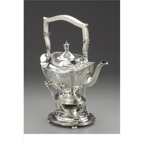 <B>An American Silver Hot Water Kettle on Stand</B></I><BR><BR>Unknown maker, American<BR>Retailed by Theodore B. Starr, Inc., New York, New York<BR>Twentieth Century<BR>Silver and ivory<BR>Marks: (unidentified maker's mark), <I>STERLING, A2446, 2 3/4 PINT, D21, THEODORE B. STARR, INC., NEW YORK, PATENTED 1915,</B></I> (knife)<BR>13.5 in. high, 44.48 troy ounces<BR><BR>The body of lobed oval form with chased florate scroll decoration, urn finial to lid and ivory insulators to handle; sitting on a stand with bun feet; separate spirit burner.