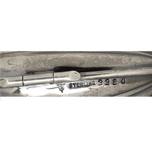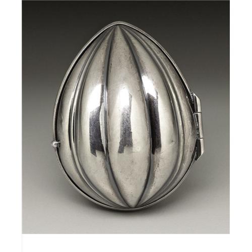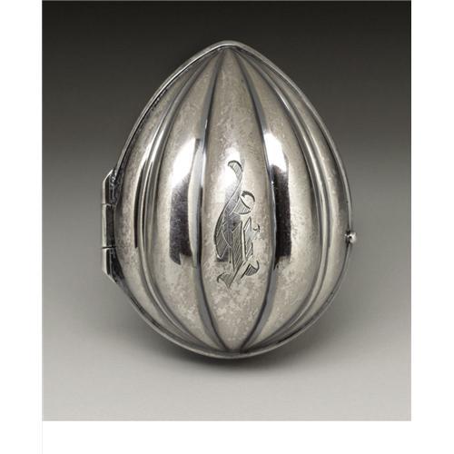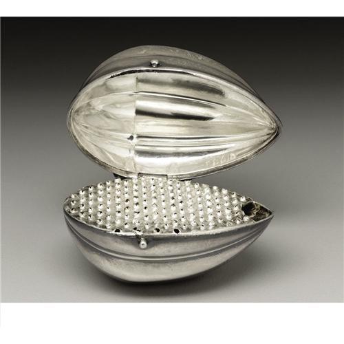 <B>An American Silver Nutmeg Grater</B></I> <BR><BR>Unknown maker, American<BR>Nineteenth Century<BR>Silver and steel<BR>Marks: <I>S</B></I> or <I>L</B></I> in shield, <I>STERLING 2280</B></I><BR>2 in. long<BR><BR>Of fluted nut form, monogrammed <I>K</B></I>; hinged steel grater.1 <BR><BR><B>Condition Report:</B> Normal signs of wear as appropriate with age. Steel grater possibly replaced.