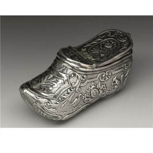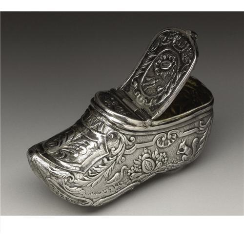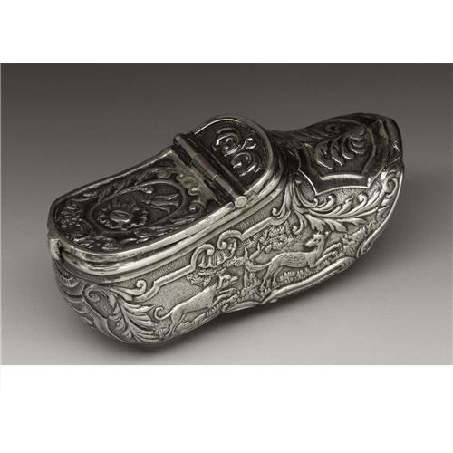 <B>An American Silver Snuff Box</B></I><BR><BR>Unknown maker, American<BR>Nineteenth Century<BR>Silver and silver gilt<BR>Marks: <I>STERLING</B></I><BR>2.75 in. long, 1 troy ounce<BR><BR>In the form of a shoe, with embossed decoration of forest animals. Silver gilt interior.<BR>