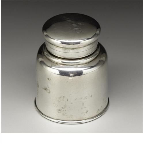 <B>An American Silver Travelling Inkwell</B></I><BR><BR>Tiffany & Co., New York, New York, 1875<BR>Silver and glass<BR>Marks: <I>TIFFANY & CO., 4280M1922, STERLING, A</B></I><BR>2.37 in. high<BR><BR>Of cylindrical form, the lid fitted with cork, glass liner; engraved <I>Augusta</B></I>.