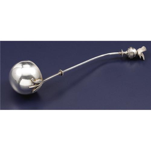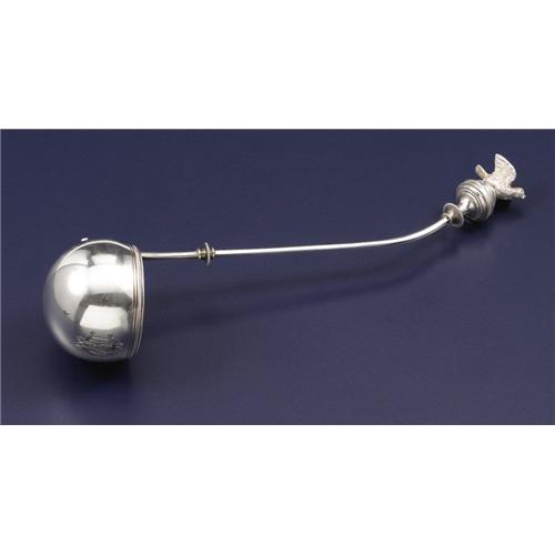 <B>An American Silver and Silver Gilt Cream Ladle</B></I><BR><BR>Unknown maker, American<BR>Circa 1860-1880<BR>Silver and silver gilt<BR>Marks: <I>BROWNE & SPAULDING STERLING PATENTED</B></I><BR>7.25 inches long<BR>1.55 troy ounces<BR><BR>The slim handle with banded half ball tip crowned by a cast bird; ball shaped bowl with gilt interior, monogrammed <I>MED.</B></I> Retailed by Browne & Spaulding.<BR><BR><b>Shipping:</b> Requires 3rd Party Shipping (<a target="_blank" href="http://www.heritageauctions.com/common/shipping.php">view shipping information</a>)
