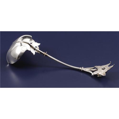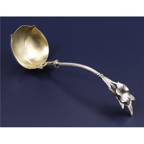 <B>An American Silver and Silver Gilt Ladle</B></I><BR><BR>Unknown maker, American<BR>Circa 1870-1890<BR>Silver and silver gilt<BR>Marks: (lion passant), <I>S,</B></I> (lion passant)<BR>10 inches long<BR>3.81 Troy ounces<BR><BR>The reeded stem terminating in cast morning glory and leaf decoration; shaped gilt bowl with leaves at junction to stem.<BR><BR><b>Shipping:</b> Requires 3rd Party Shipping (<a target="_blank" href="http://www.heritageauctions.com/common/shipping.php">view shipping information</a>)
