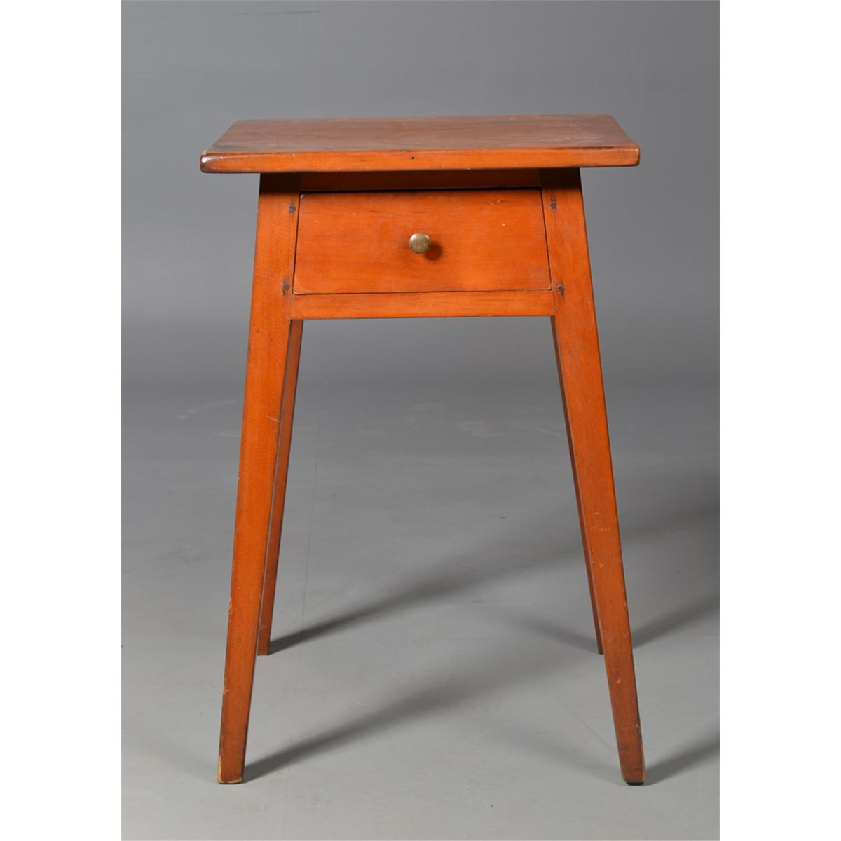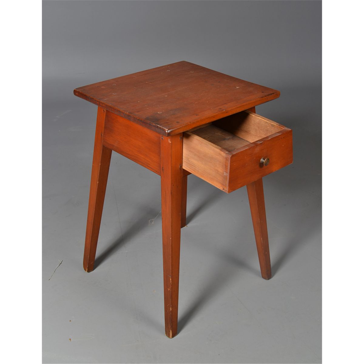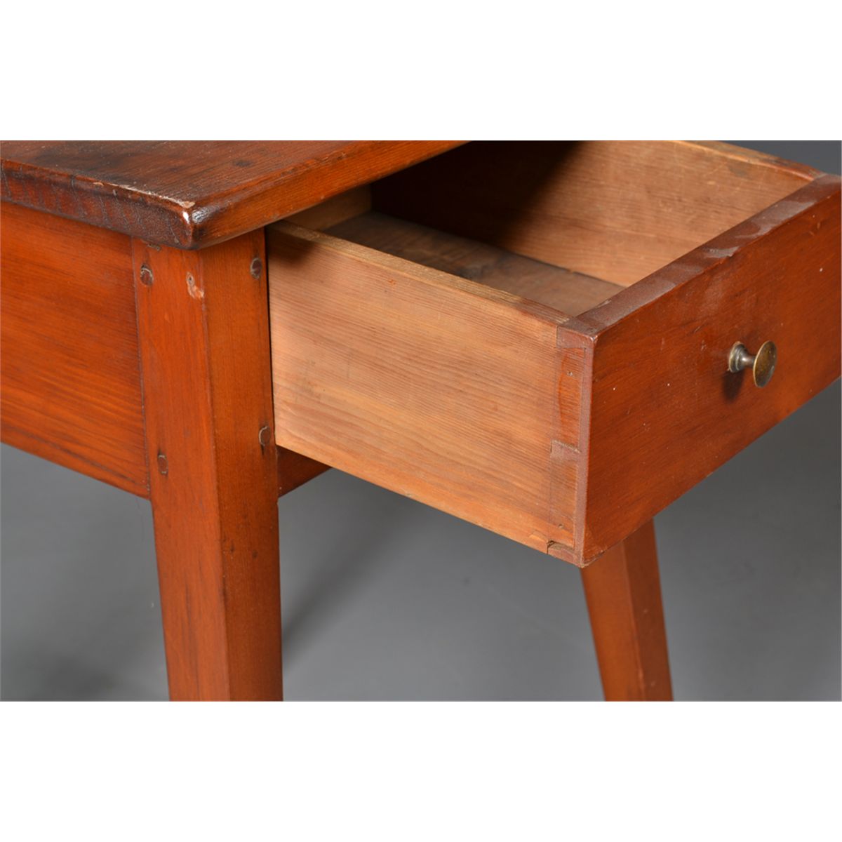 With pegged construction, a single finely dovetailed drawer with brass pull, the top with large overhang on four squared splayed legs, with old if not original varnish surface. 27.5" H x 17.5" D x 18.25" W, Circa 19th century. Private collection Gregory, MI.