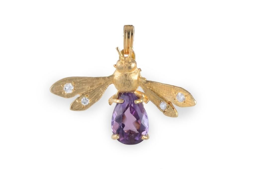 18K yellow gold bee pendant with a 8.9 carat amethyst body and four G/VS diamonds totaling 0.15 carat. Stamped 750. Length 1 inch excluding bail. Weight 5.8g.