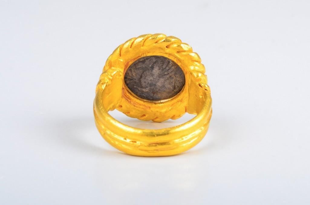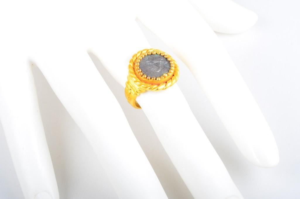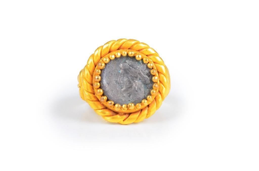 Set in 22K yellow gold with a rope-style pattern; appears to be signed with MMM; size of 6 1/4, weight 13.7g.