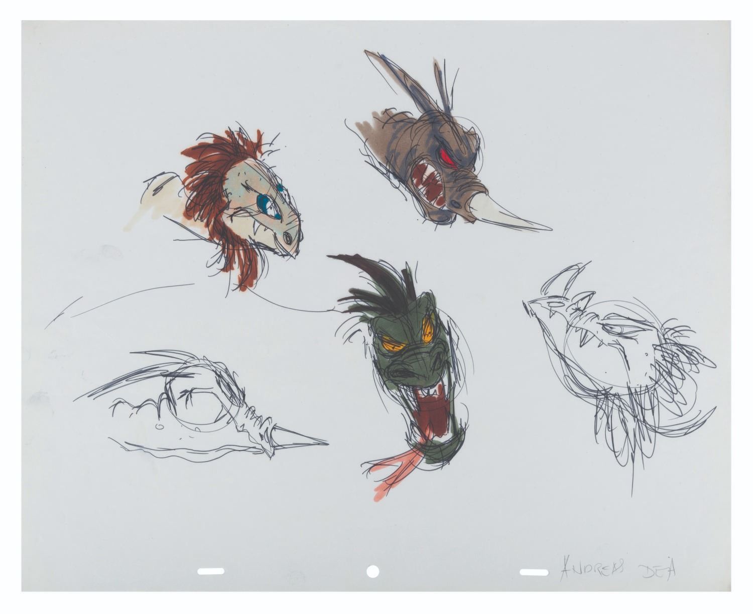 (Disney, 1980) An Andreas Deja signed sheet of Gwythaint concepts from the production of "The Black Cauldron." These early drawings of the villainous dragon-like creatures are accomplished in water-based inks by artist Andreas Deja. The artwork measures 10” x 14" on a 12.5” x 15.5" untrimmed animation paper and is in very good condition with minor wear from production.