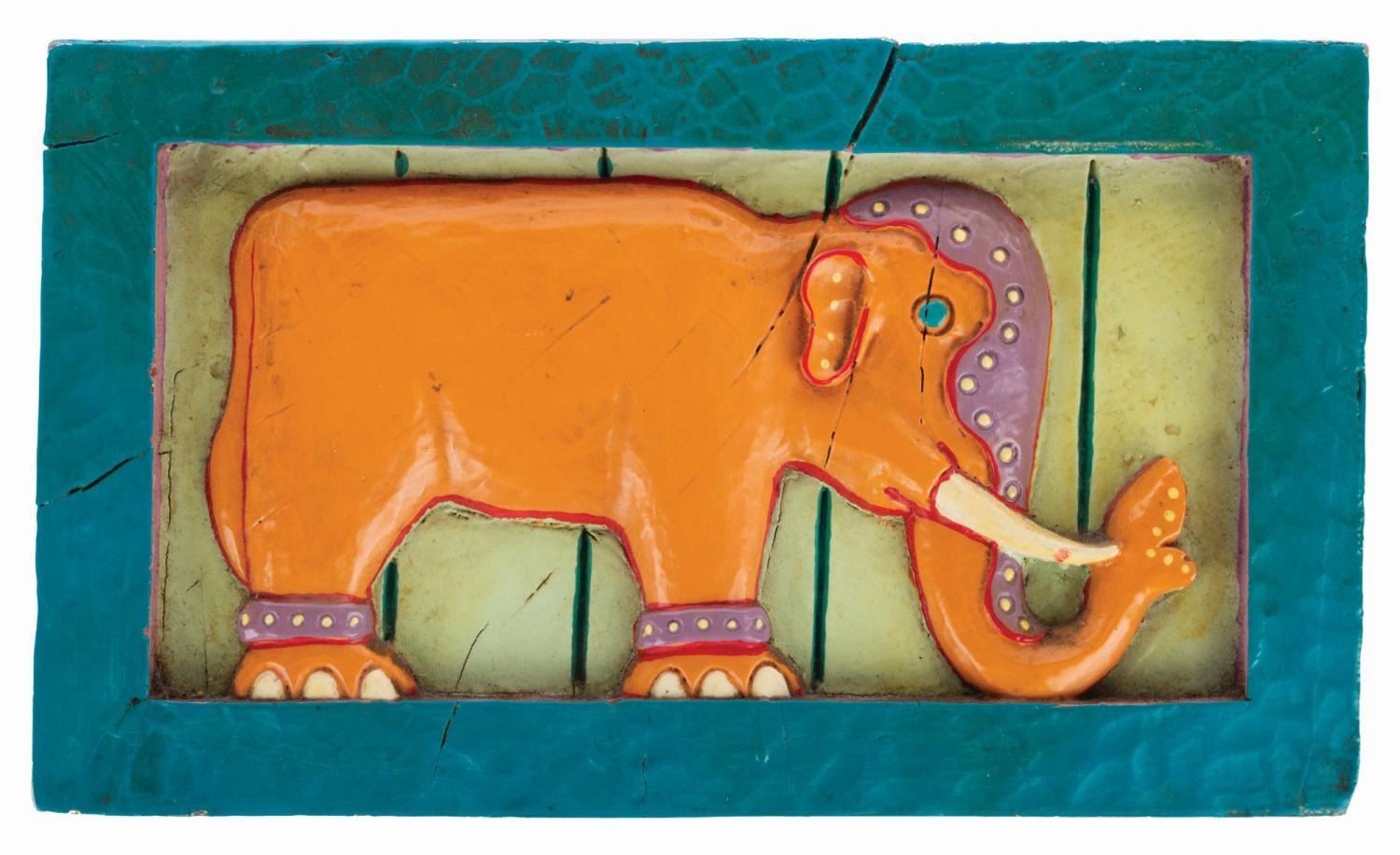 (Disney’s Animal Kingdom, 1990s-2010s) A fiberglass hand-painted sign of an orange elephant from Disney’s Animal Kingdom. Measuring 7” x 12”, the sign is in very good condition with intentional distress and typical wear from Park use.