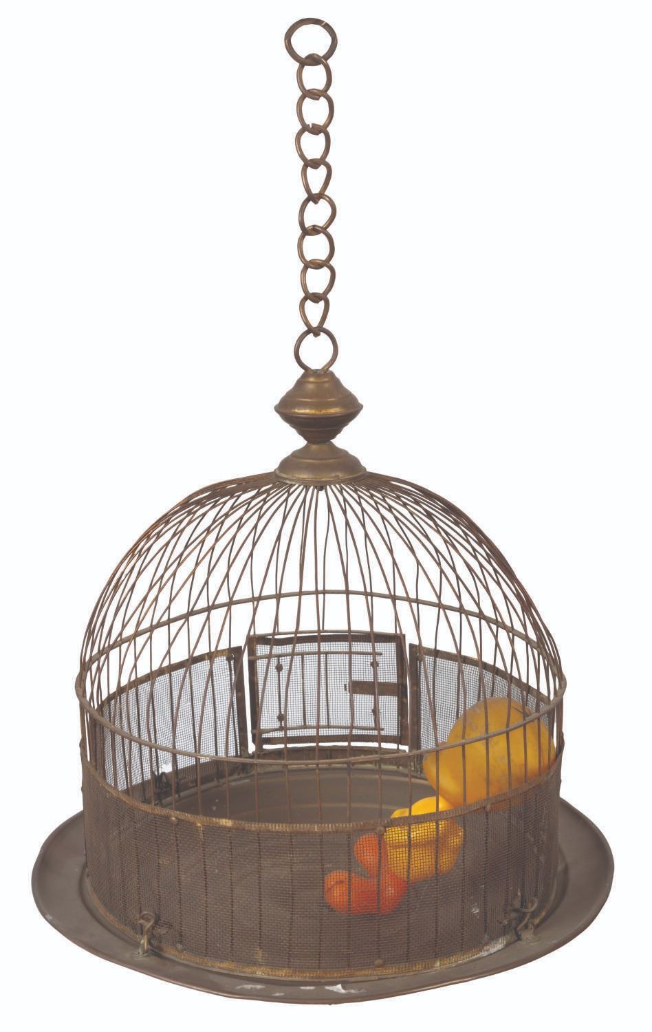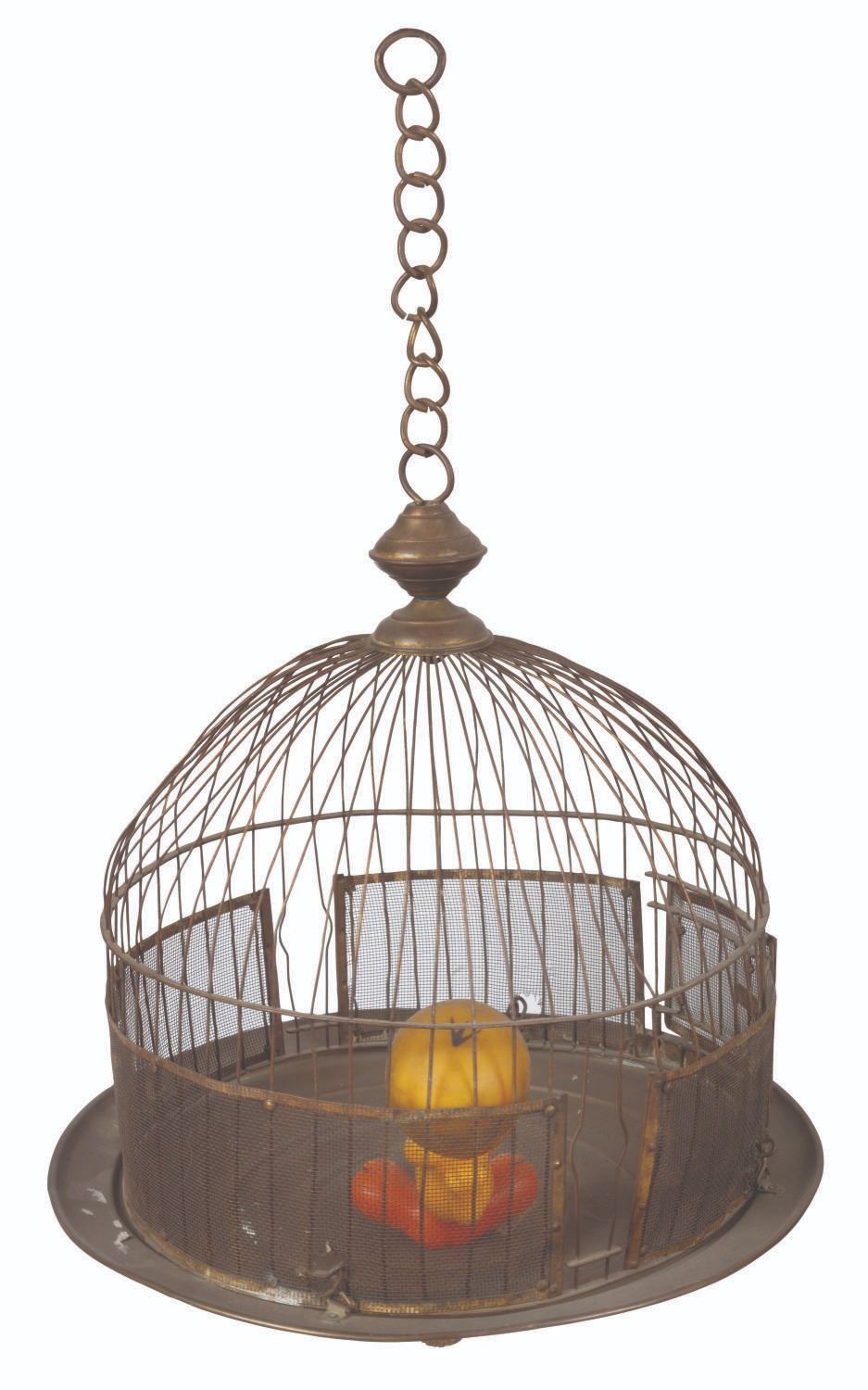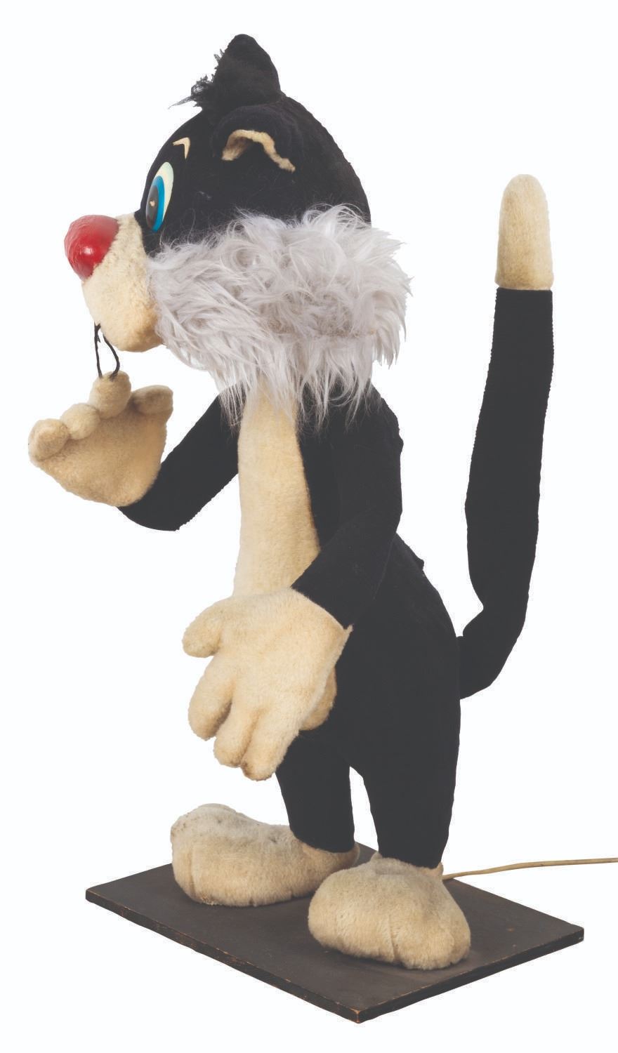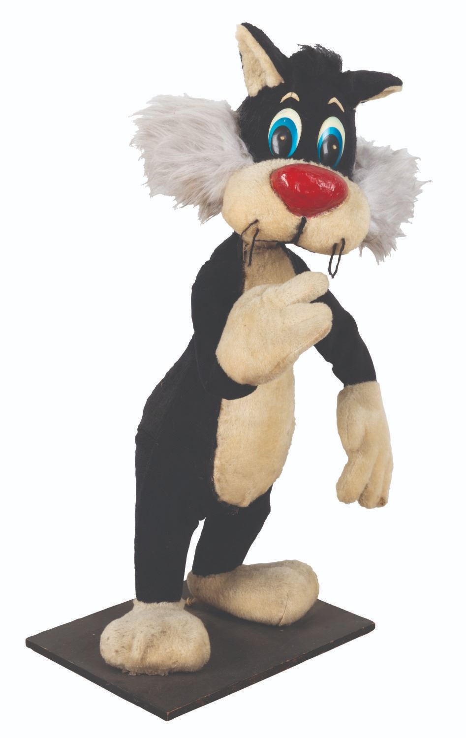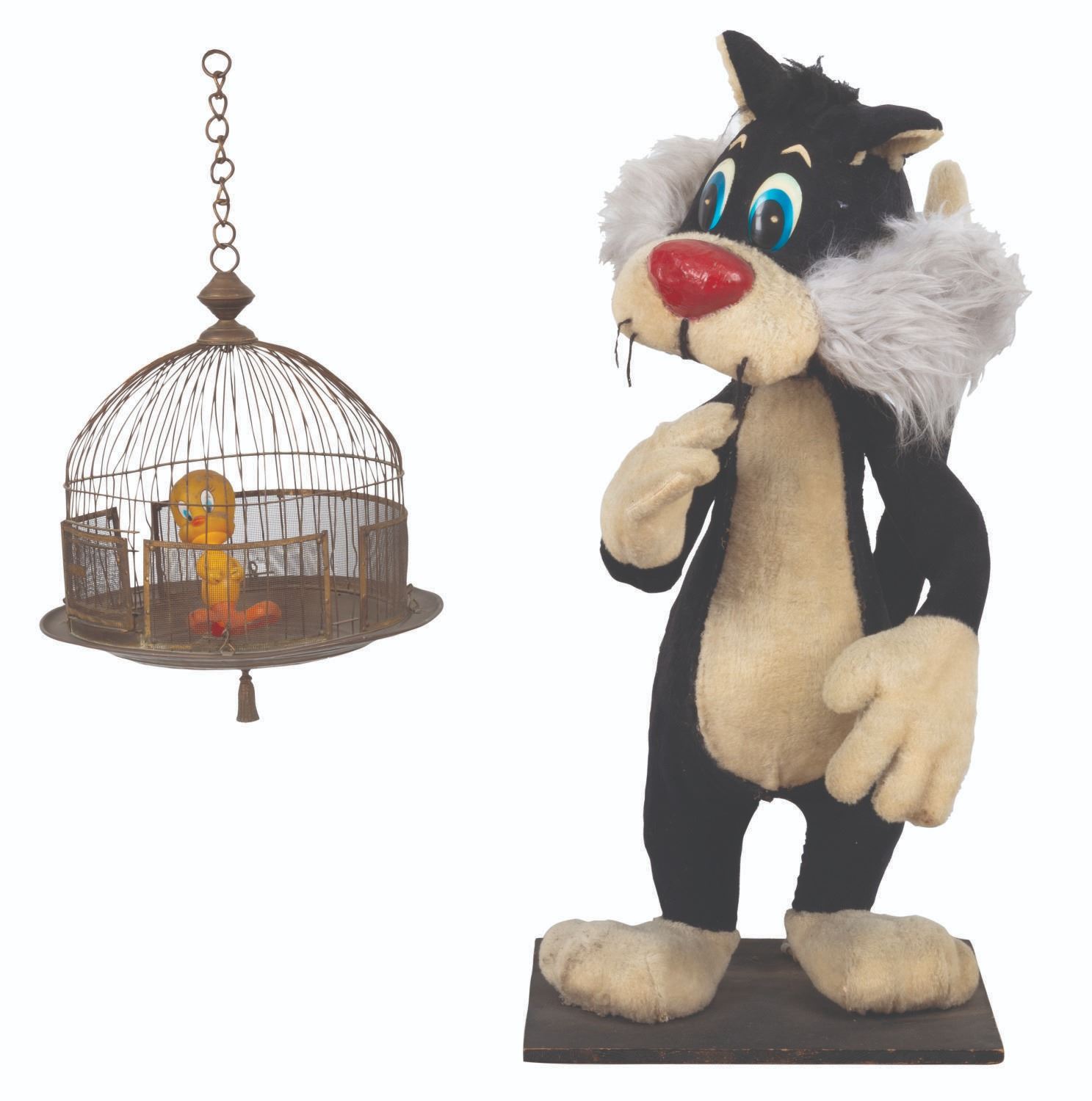 (1970s-80s) An animated figure of Sylvester with Tweety Bird, likely used as a store display. The hand-made motor-operated Sylvester figure moves his arms and head, and worked when tested. The Tweety figurine is a toy by Dakin from the 1960s and early 70s. Measuring 11.75” x 15.75” x 33” tall, Sylvester displays in good condition with soiling, discoloration, and loose stitching at the back of the arms. Tweety measures 6.5” tall and displays in very good condition with light discoloration. The metal cage measures 23” x 13” in diameter and displays in good condition with soiling, tarnish, and bent wires. This item requires special shipping arrangements. Please inquire before bidding.