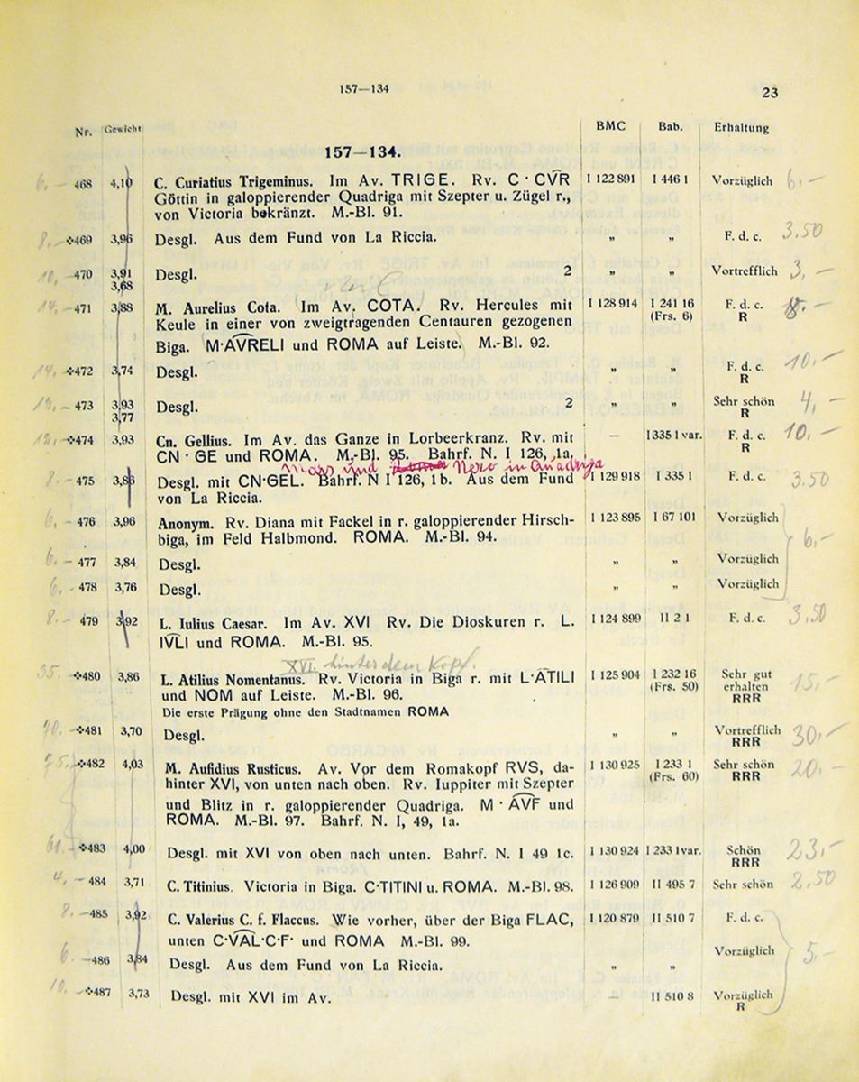 Cahn, Adolph E., and Adolph Hess. DIE GOLD- UND SILBERMUNZEN DER ROMISCHEN REPUBLIK BIS 15 V. CHR. SAMMLUNG JUSTIZRAT DR. JUR. ET PHIL. H.C. ERNST JUSTUS HAEBERLIN. Frankfurt am Main, 17. Juli 1933. 4to, contemporary cloth-backed boards. Fine frontispiece portrait; (8), 190 pages; 3304 lots; index of rulers; 29 excellent plates of coins. Valuations list bound in. Heavily annotated, with estimates and prices realized, occasional notes on buyers and notes on the coins themselves. Binding worn and taped; very good or so. A heavily used copy of a very important sale, comprising prima facie evidence of RBW’s unerring devotion to his chosen field. Includes a 3-page biography of Haeberlin written by Herbert A. Cahn. Clain-Stefanelli 3755*. Grierson 283. Kroh 69 (5 stars): “The sale contained 3304 lots, the finest ever offered. The catalogue was prepared with the utmost care (and the able assistance of Dr. Max von Bahrfeldt) and the introduction was written by a very young Herbert A. Cahn... This catalogue is so excellent, it has been frequently utilized as a basic reference (à la Pozzi). Originals are very rare.” Spring 84 [also listed under “Most important sales of struck Roman Republican coins”]. Ex Douglas Saville. Ex RBW Library.