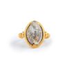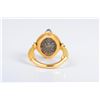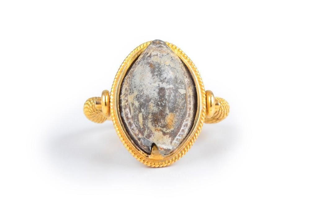Set with a carved Egyptian shell, mounted in a 22K yellow gold spring-loaded bezel; size of 2 to 3; weight 4.8g.