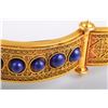 Containing 11 lapis beads and crafted of 14K yellow/white gold; the word ROMA shows on the back side; the bangle opens when a pin is pulled from the clasp; inner circumference of approximately 6-1/2 inches; showing a minor dent to the side of the bangle, on the front; weight 28.4g.