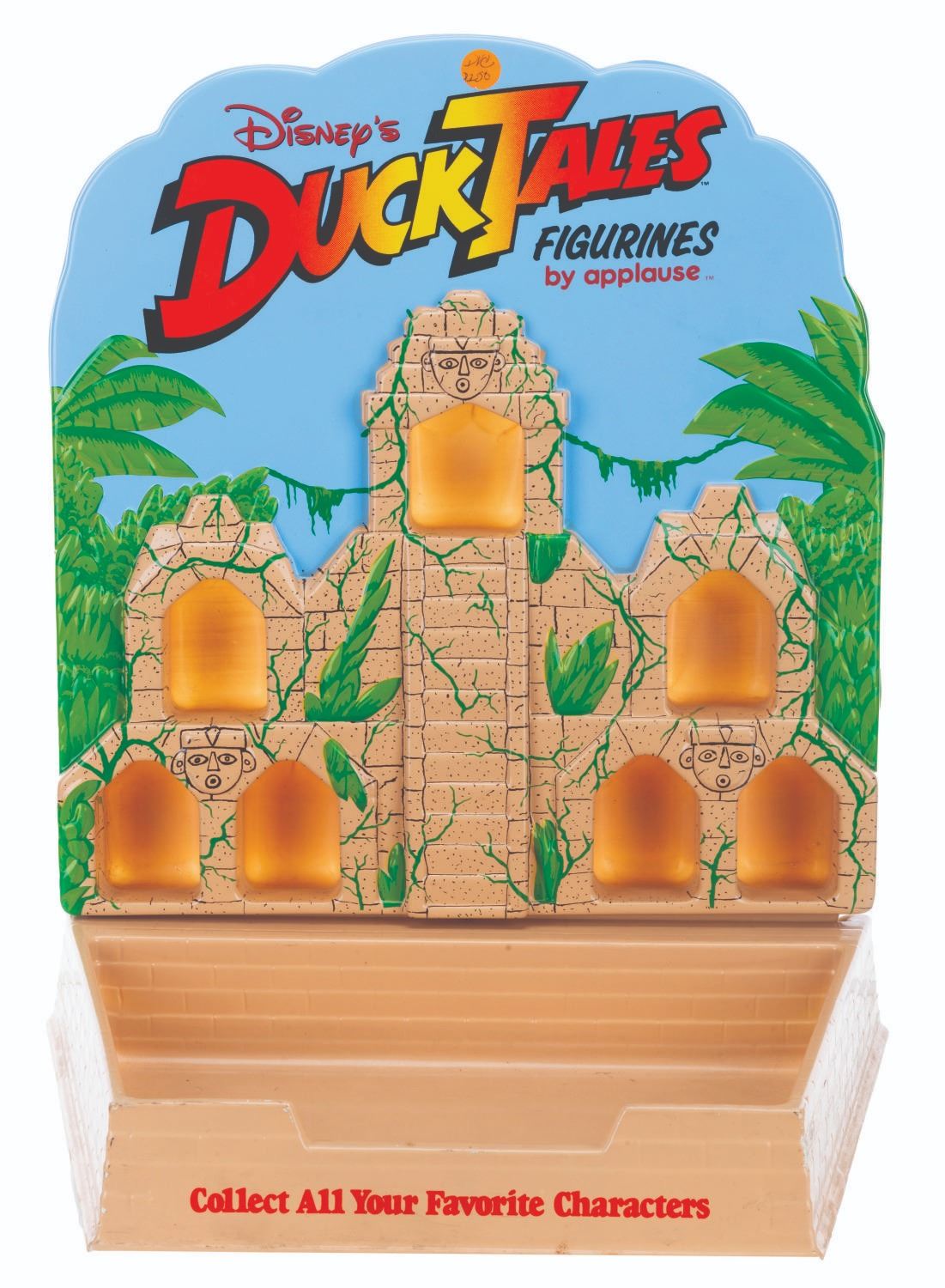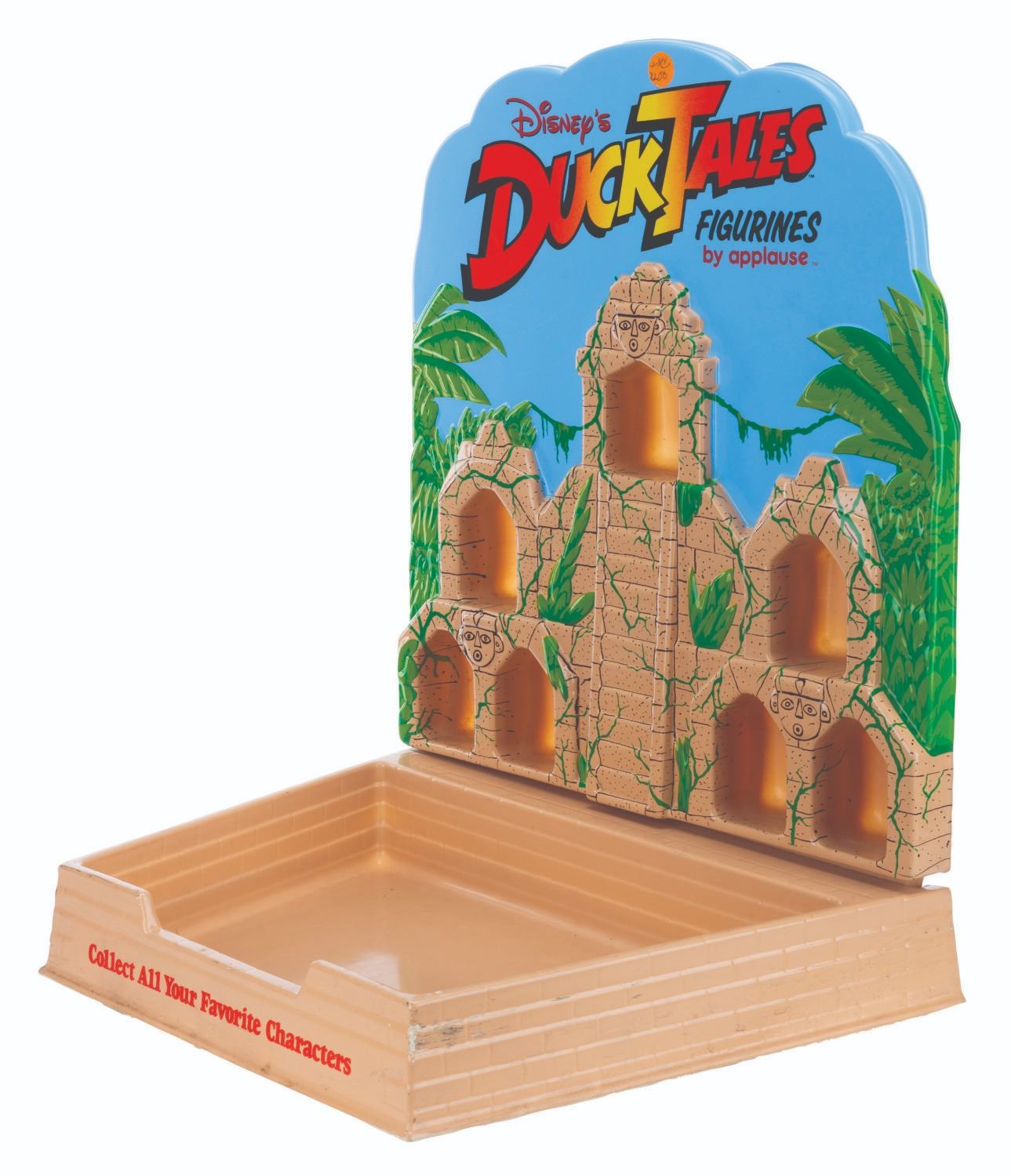 (Applause, 1980s) A jungle temple-themed store display for the "DuckTales" figurine line by Applause. Measuring 17" x 13.5" x 20.5" tall, the display is in good condition with stains, dents, scuffs, a 0.75" x 1" section missing from the side, wear from use, and an adhesive at the top center.